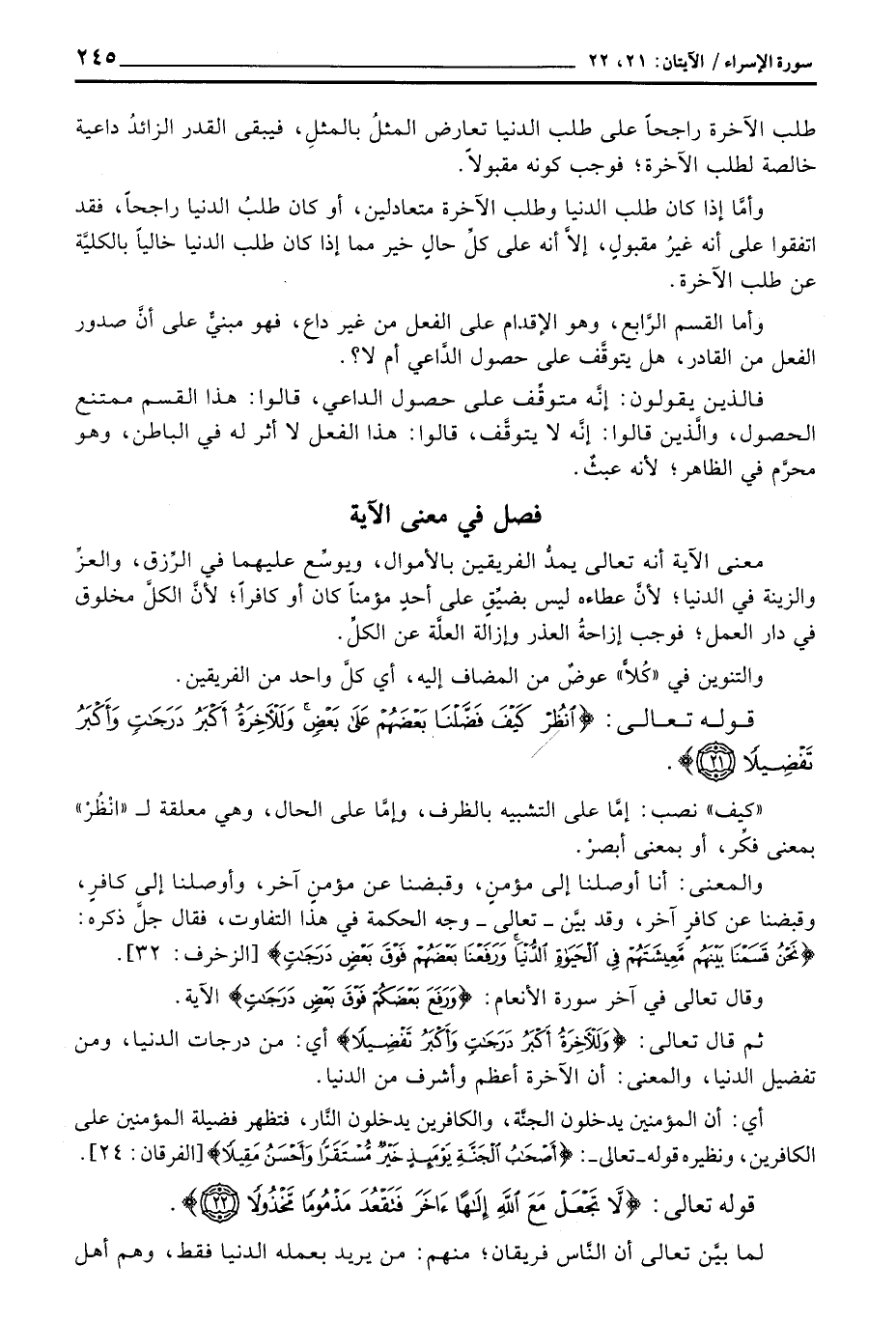 ثم قال تعالى: {وَلَلآخِرَةُ أَكْبَرُ دَرَجَاتٍ وَأَكْبَرُ تَفْضِيلاً} أي: من درجات الدنيا، ومن تفضيل الدنيا، والمعنى: أن الآخرة أعظم وأشرف من الدنيا.