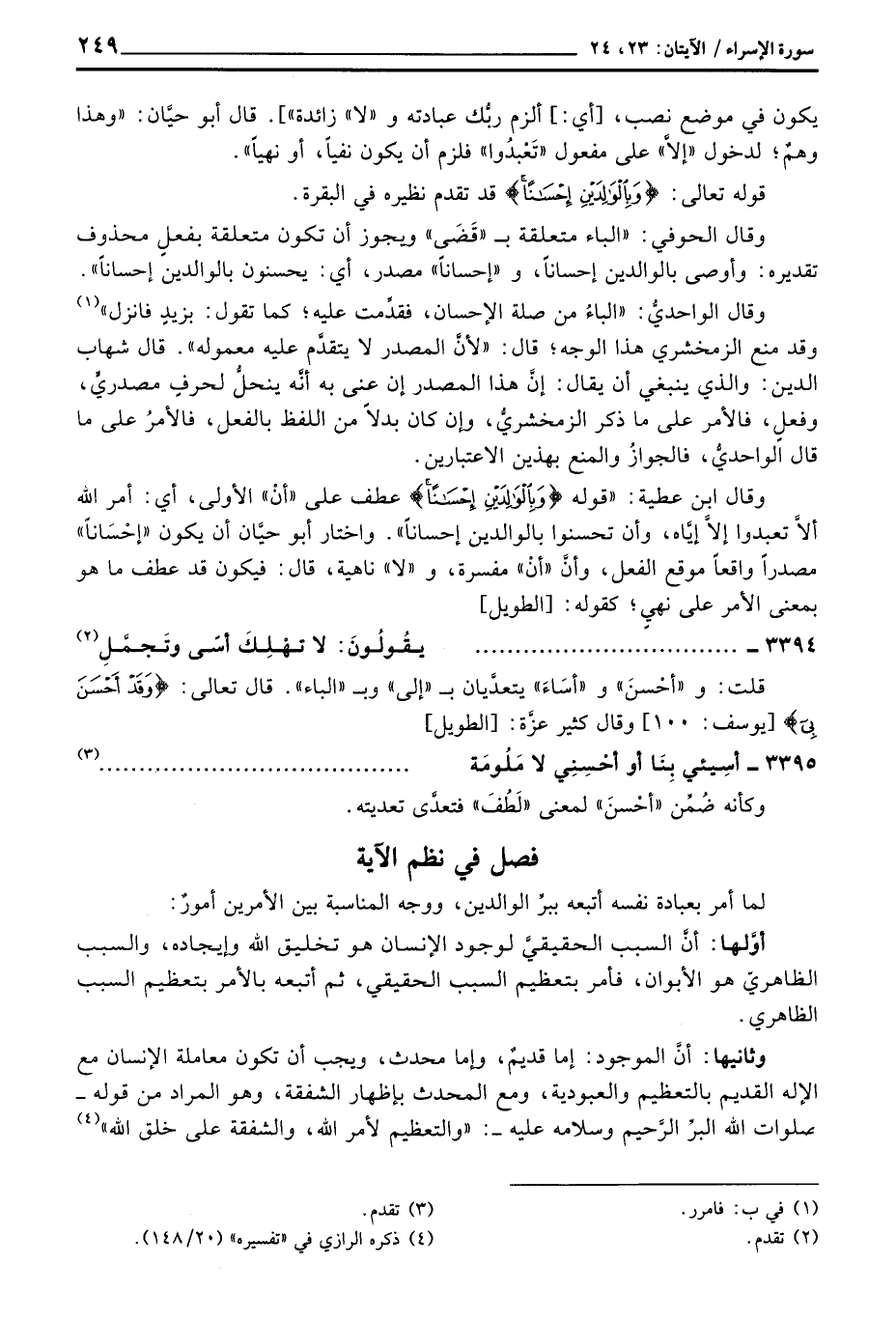 وقال الحوفي: «الباء متعلقة ب» قَضَى «ويجوز أن تكون متعلقة بفعلٍ محذوف تقديره: وأوصى بالوالدين إحساناً، و» إحساناً «مصدر، أي: يحسنون بالوالدين إحساناً» .