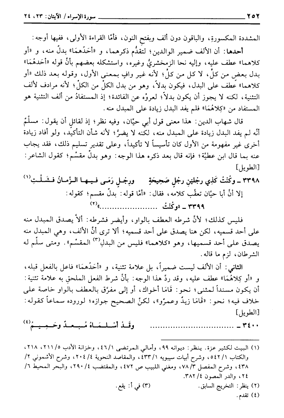 أحدها: أن الألف ضمي رالوالدين؛ لتقدُّم ذكرهما، و «أحَدُهمَا» بدلٌ منه، و «أو كلاهما» عطف عليه، وإليه نحا الزمخشريُّ وغيره، واستشكله بعضهم بأنَّ قوله «أحَدهُمَا» بدل بعضٍ من كلٍّ، لا كل من كلٍّ؛ لأنه غير وافٍ بمعنى الأول، وقوله بعد ذلك «أو كلاهما» عطف على البدل، فيكون بدلاً، وهو من بدل الكلِّ من الكلِّ؛ لأنه مرادف لألف التثنية، لكنه لا يجوز أن يكون بدلاً؛ فعروِّه عن الفائدة؛ إذ المستفادُ من ألف التثنية هو المستفاد من «كِلاهمَا» فلم يفد البدل زيادة على المبدل منه.