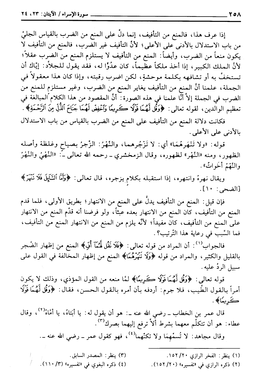 إذا عرف هذا، فالمنع من التأفيف، إنما دلَّ على المنع من الضرب بالقياس الجليِّ من باب الاستدلال بالأدنى على الأعلى؛ لأنَّ التأفيف غير الضرب، فالمنع من التأفيف لا يكون منعاً من الضرب، وأيضاً: المنع من التأفيف لا يستلزم المنع من الضرب عقلاً؛ لأنَّ الملك الكبير، إذا أخذ ملكاً عظيماً، كان عدُوًّا له، فقد يقول للجلاَّد: إيَّاك أن تستخفَّ به أو تشافهه بكلمة موحشةٍ، لكن اضرب رقبته، وإذا كان هذا معقولاً في الجملة، علمنا أنَّ المنع من التأفيف يغاير المنع من الضرب، وغير مستلزم للمنع من الضرب في الجملة إلاَّ أنَّا علمنا في هذه الصورة: أنَّ المقصود من هذا الكلام المبالغة في تعظيم الوالدين، لقوله تعالى: {وَقُل لَّهُمَا قَوْلاً كَرِيماً واخفض لَهُمَا جَنَاحَ الذل مِنَ الرحمة} .