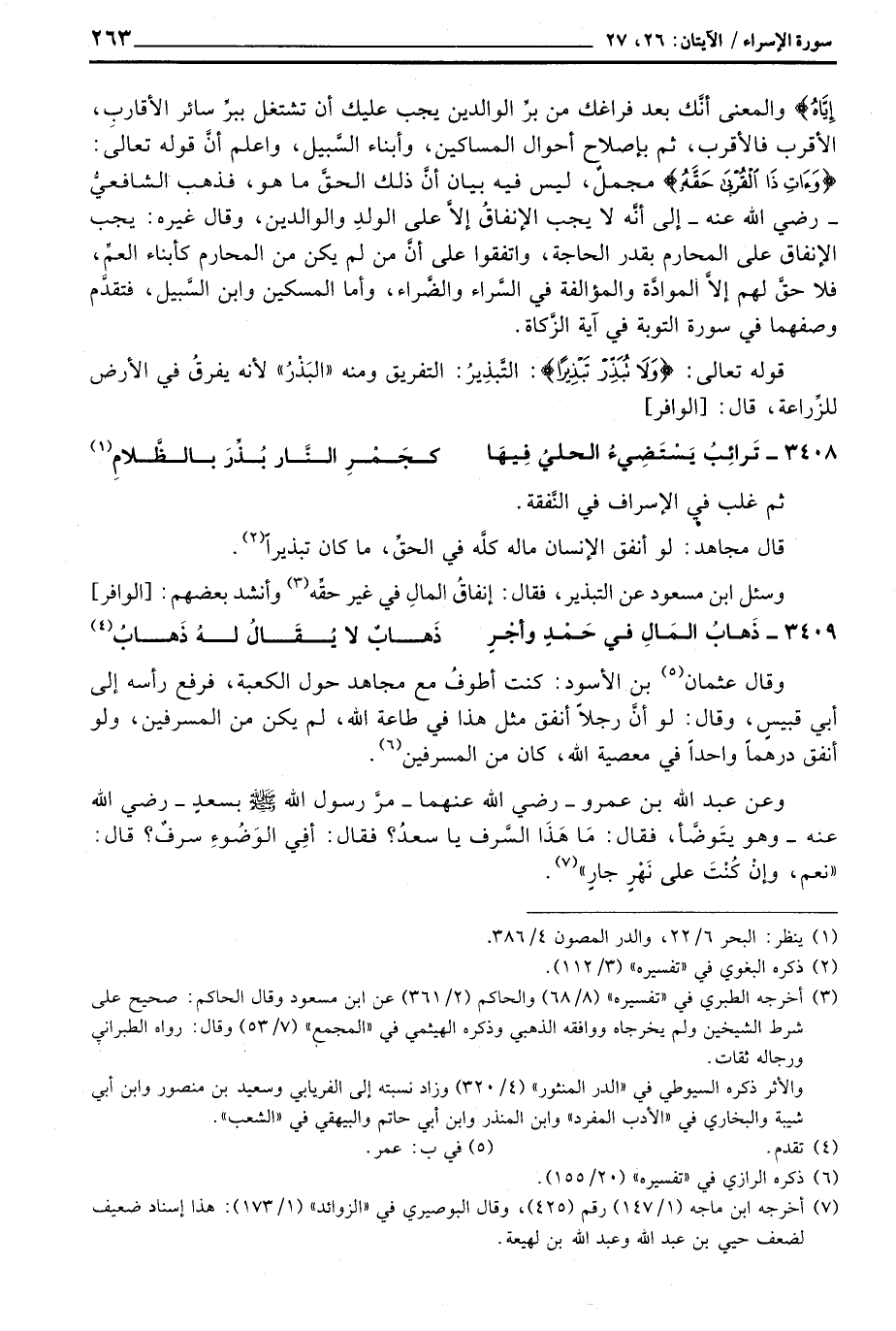 إِيَّاهُ} [الإسراء: 23] والمعنى أنَّك بعد فراغك من برِّ الوالدين يجب عليك أن تشتغل ببرِّ سائر الأقاربِ، الأقرب فالأقرب، ثم بإصلاح أحوال المساكين، وأبناء السَّبيل، واعلم أنَّ قوله تعالى: {وَآتِ ذَا القربى حَقَّهُ} مجملٌ، ليس فيه بيان أنَّ ذلك الحقَّ ما هو، فذهب الشافعيُّ - رَضِيَ اللَّهُ عَنْه - إلى أنَّه لا يجب الإنفاقُ إلاَّ على الولدِ والوالدين، وقال غيره: يجب الإنفاق على المحارم بقدر الحاجة، واتفقوا على أنَّ من لم يكن من المحارم كأبناء العمِّ، فلا حقَّ لهم إلاَّ الموادَّة والمؤالفة في السَّراء والضَّراء، وأما المسكين وابن السَّبيل، فتقدَّم وصفهما في سورة التوبة في آية الزَّكاة.