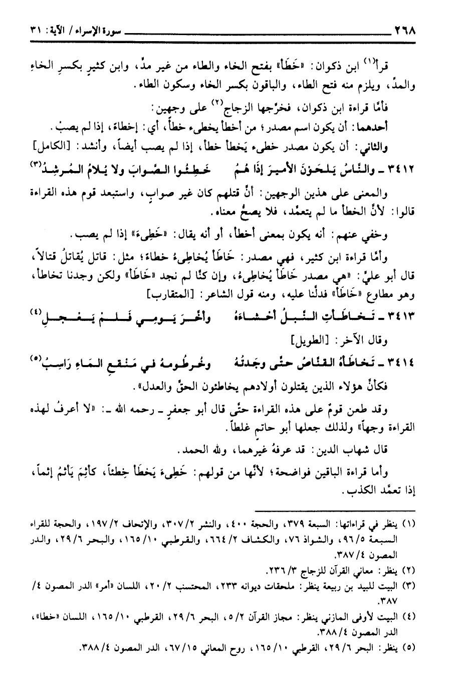 وأمَّا قراءة ابن كثير، فهي مصدر: خَاطَأ يُخاطِئُ خطاءً؛ مثل: قاتل يُقاتلُ قتالاً، قال أبو عليٍّ: «هي مصدر خَاطَأ يُخاطِئُ، وإن كنَّا لم نجد» خَاطَأ «ولكن وجدنا تخاطأ، وهو مطاوع» خَاطَأ «فدلَّنا عليه، ومنه قول الشاعر: [المتقارب]