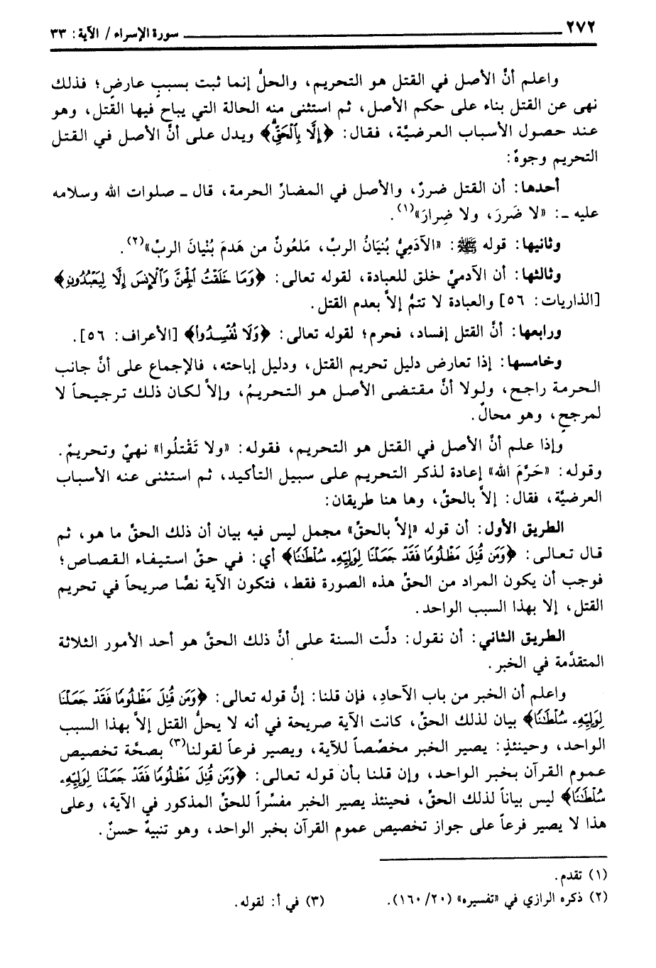 وإذا علم أنَّ الأصل في القتل هو التحريم، فقوله: «ولا تَقْتلُوا» نهيٌ وتحريمٌ. وقوله: «حَرَّمَ الله» إعادة لذكر التحريم على سبيل التاكيد، ثم استثنى عنه الأسباب العرضيَّة، فقال: إلاَّ بالحقِّ، وها هنا طريقان: