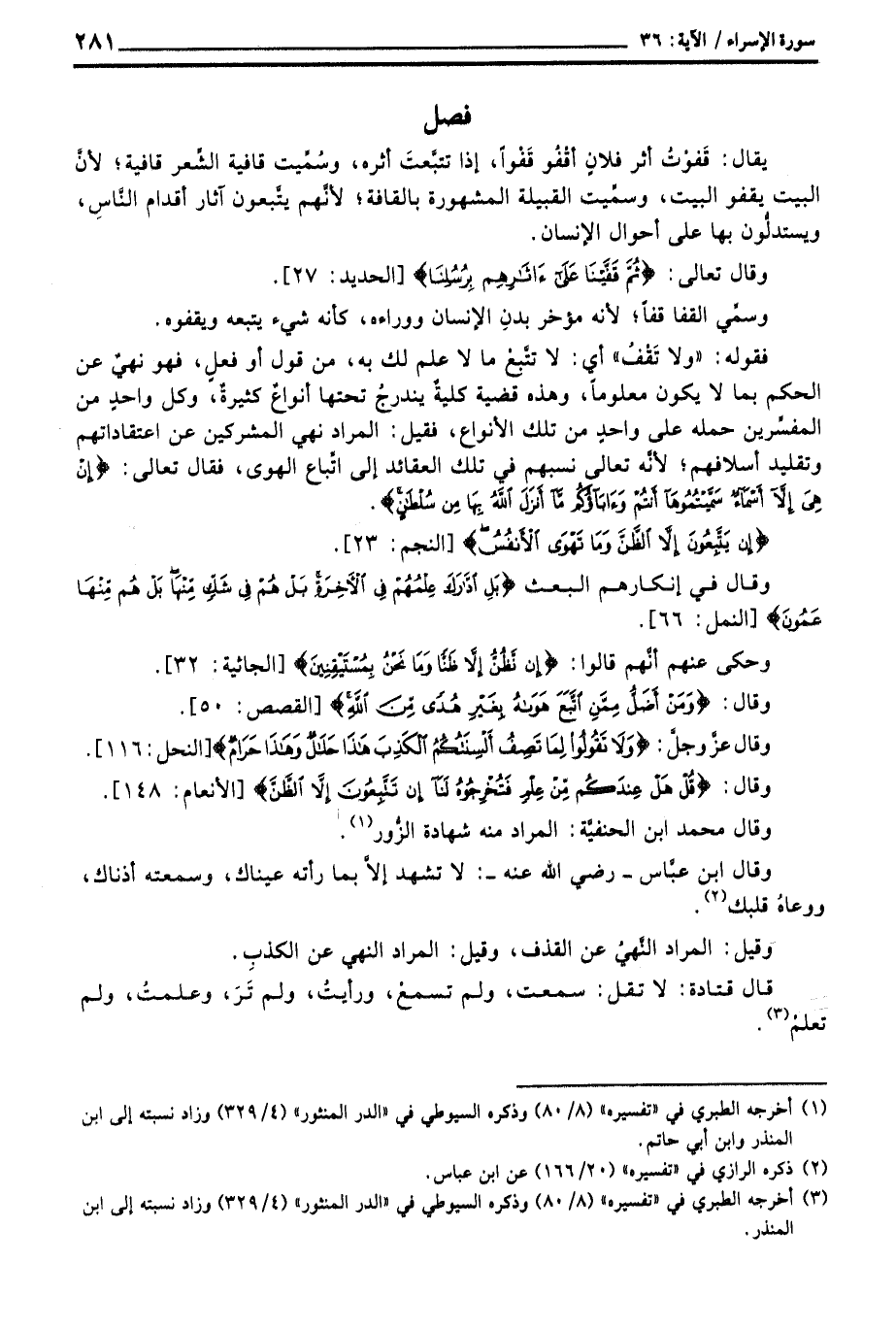 فقوله: «ولا تَقْفُ» أي: لا تتَّبعْ ما لا علم لك به، من قول أو فعلٍ، فهو نهيٌ عن الحكم مبا لا يكون معلوماً، وهذه قضية كليةٌ يندرجُ تحتها أنواعٌ كثيرةٌ، وكل واحدٍ من المفسِّرين حمله على واحدٍ من تلك الأنواع، فقيل: المراد نهي المشركين عن اعتقاداتهم وتقليد أسلافهم؛ لأنَّه تعالى نسبهم في تلك العقائد إلى اتِّباع الهوى، فقال تعالى: {إِنْ هِيَ إِلاَّ أَسْمَآءٌ سَمَّيْتُمُوهَآ أَنتُمْ وَآبَآؤُكُم مَّآ أَنَزَلَ الله بِهَا مِن سُلْطَانٍ} [النجم: 23] .