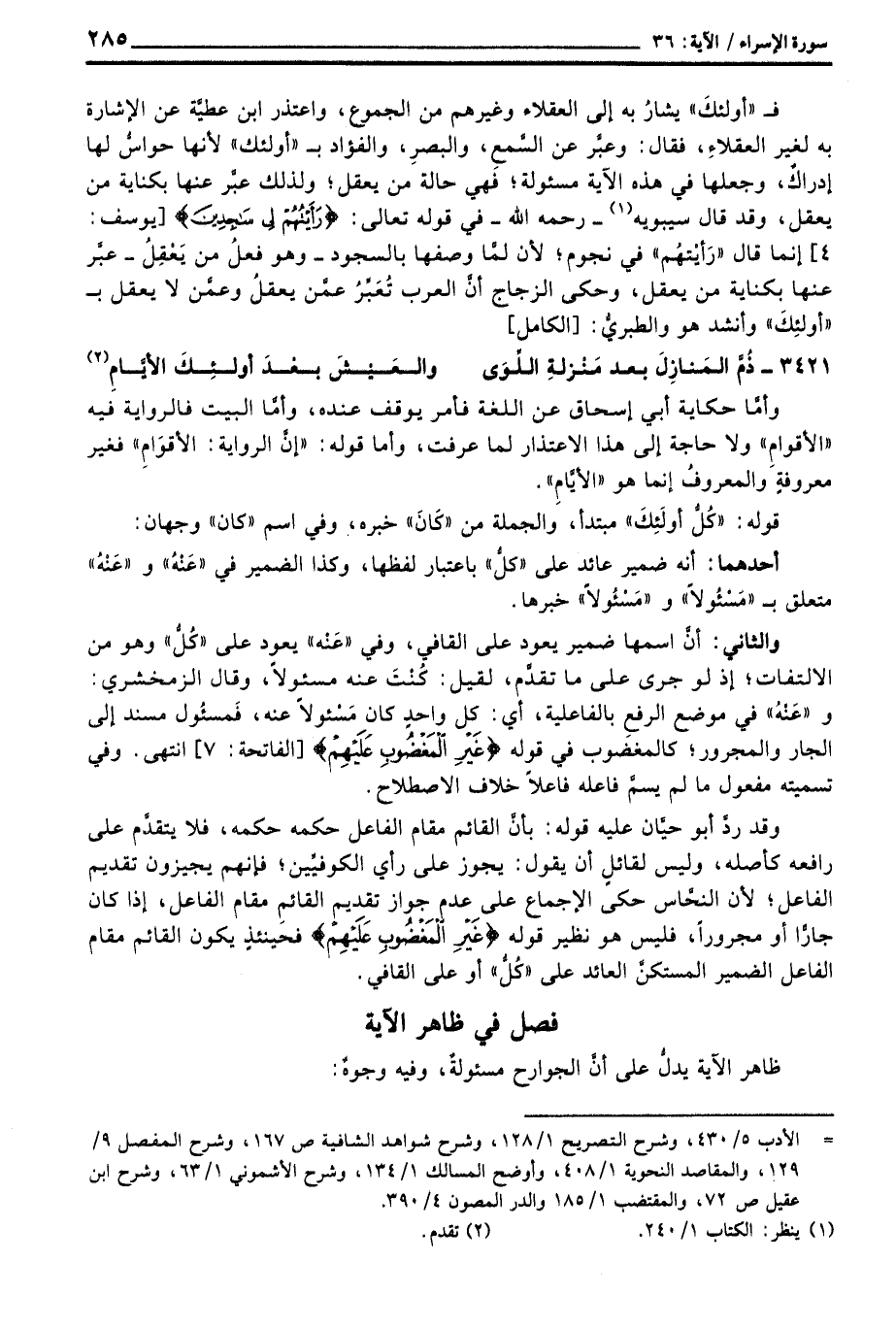 والثاني: أنَّ اسمها ضمير يعود على القافي، وفي «عَنْه» يعود على «كُلُّ» وهو من الالتفات؛ إذ لو جرى على ما تقدَّم، لقيل: كُنْتَ عنه مسئولاً، وقال الزمخشري: و «عَنْهُ» في موضع الرفعِ بالفاعلية، أي: كل واحدٍ كان مَسْئولاً عنه، فَمسئُول مسند إلى الجار والمجرور؛ كالمغضوب في قوله {غَيْرِ المغضوب عَلَيْهِم} [الفاتحة: 7] انتهى. وفي تسميته مفعول ما لم يسمَّ فاعله فاعلاً خلاف الاصطلاح.