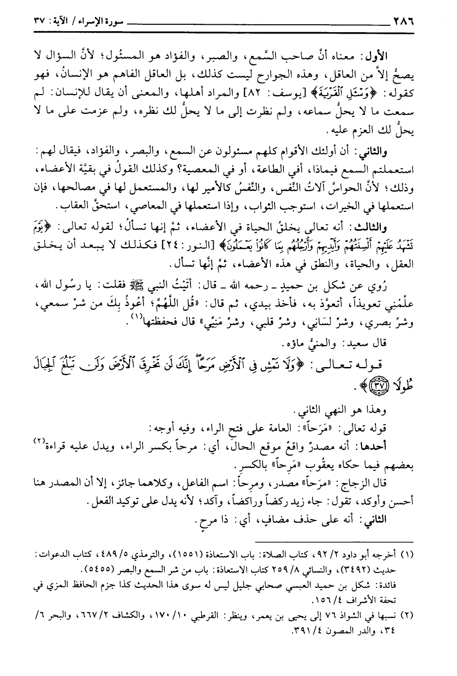 الأول: معناه أنَّ صاحب السَّمع، والبصر، والفؤاد هو المسئُول؛ لأنَّ السؤال لا يصحُّ إلاَّ من العاقل، وهذه الجوارح ليست كذلك، بل العاقل الفاهم هو الإنسان: لم سمعت ما لا يحلُّ سماعه، ولم نظرت إلى ما لا يحلُّ لك نظره، ولم عزمت على م الا يحلُّ لك العزم عليه.