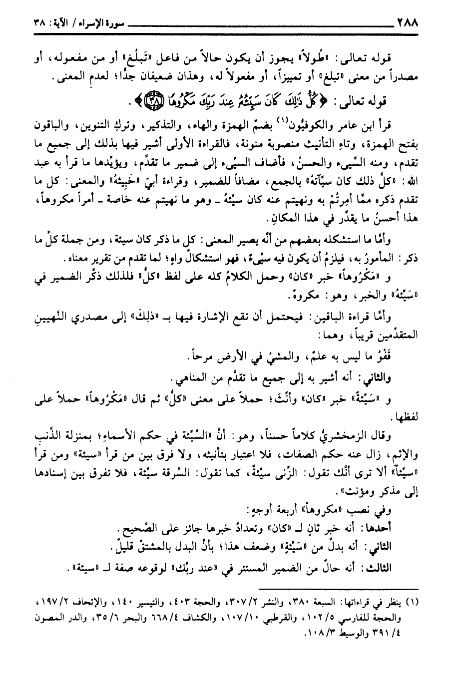 قرأ ابن عامر والكوفيُّون بضمِّ الهمزة والهاء، والتذكير، وتركِ التنوين، والباقون بفتح الهمزة، وتاءِ التأنيث منصوبة منونة، فالقراءة الأولى أشير فيها بذلك غلى جميع ما تقدم، ومنه السَّيئ والحسنُ، فأضاف السيِّئ إلى ضمير ما تقدَّم، ويؤيِّدها ما قرأ به عبد الله: «كلُّ ذلك كان سيِّئاتهُ» بالجمع، مضافاً للضمير، وقراءة أبيّ «خَبِيثهُ» والمعنى: كل ما تقدم ذكره ممَّا أمِرتُمْ به ونهيتم عنه كان سيِّئهُ - وهو ما نهيتم عنه خاصة - أمراً مكروهاً، هذا أحسنُ ما يقدِّر في هذا المكانِ.