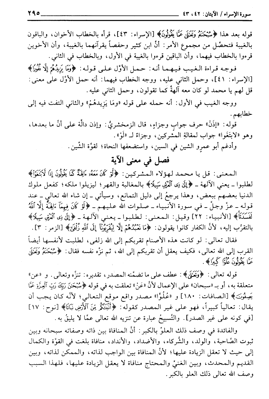 قوله تعد هذا {سُبْحَانَهُ وتعالى عَمَّا يَقُولُونَ} [الإسراء: 43] ، قرأه بالخطاب الأخوان، والباقون بالغيبة فتحصَّل من مجموع الأمر؛ أنَّ ابن كثير وحفصاً يقرآنهما بالغيبة، وأن الأخوين قرءوا بالخطاب فيهما، وأن الباقين قرءوا بالغيبة في الأول، وبالخطاب في الثاني.