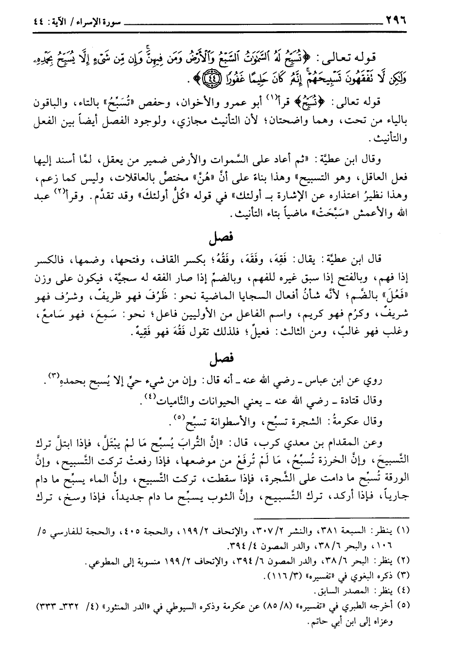وقال ابن عطيَّة: «ثم أعاد على السَّموات والأرض ضمير من يعقل، لمَّا أسند إليها فعل العاقل، وهو التسبيح» وهذا بناءً على أنَّ «هُنَّ» مختصٌّ بالعاقلات، وليس كما زعم، وهذا نظيرُ اعتذاره عن الإشارة ب أولئك «في قوله» كُلُّ أولئكَ «وقد تقدَّم. وقرأ عبد الله والأعمش» سَبّضحَتْ «ماضياص بتاء التأنيث.