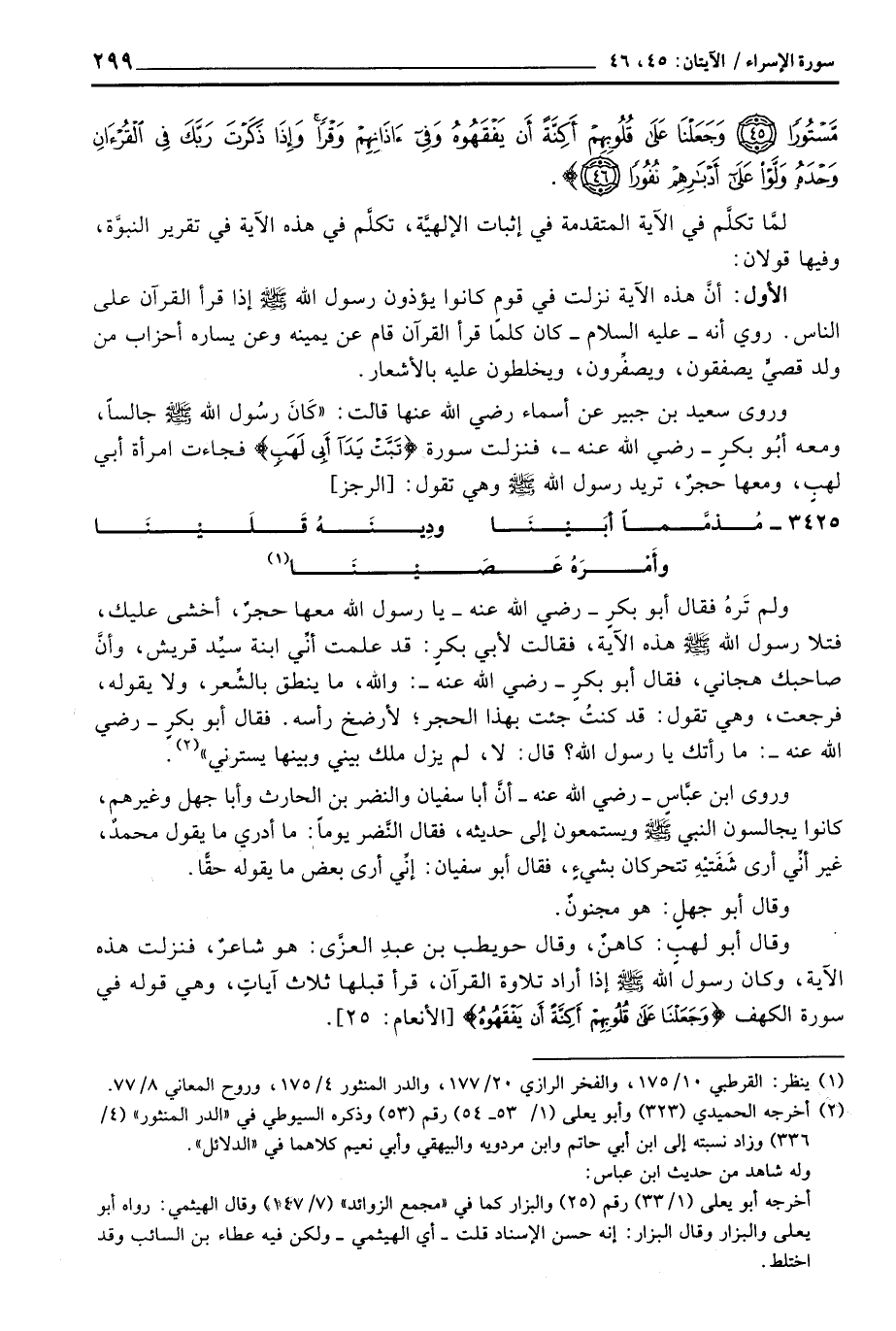 وقال أبو لهبٍ: كاهنٌ، وقال حويطب بن عبدِ العزَّى: هو شاعرٌ، فنزلت هذه الآية، وكان رسول الله صَلَّى اللَّهُ عَلَيْهِ وَسَلَّم َ إذا أراد تلاوة القرآن، قرأ قبلها ثلاث آياتٍ، وهي قوله في سورة الكهف {وَجَعَلْنَا على قُلُوبِهِمْ أَكِنَّةً أَن يَفْقَهُوهُ} [الأنعام: 25] .