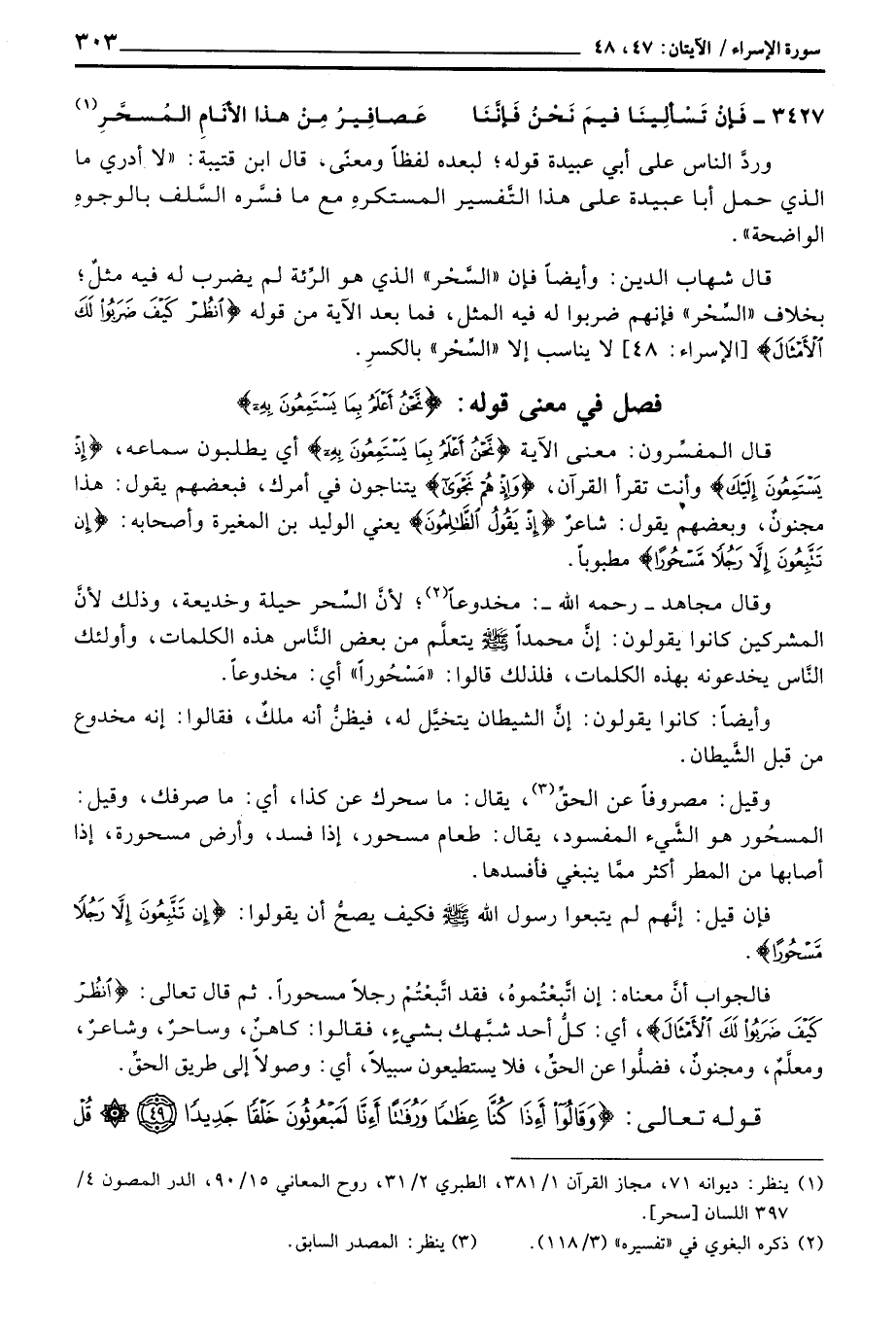 قال شهاب الدين: وأيضاً فإن «السَّحْر» الذي هو الرِّئة لم يضرب له فيه مثلٌ؛ بخلاف «السِّحْر» فإنهم ضربوا له فيه المثل، فما بعد الآية من قوله {انظر كَيْفَ ضَرَبُواْ لَكَ الأمثال} [الإسراء: 48] لا يناسب إلا «السِّحْر» بالكسرِ.