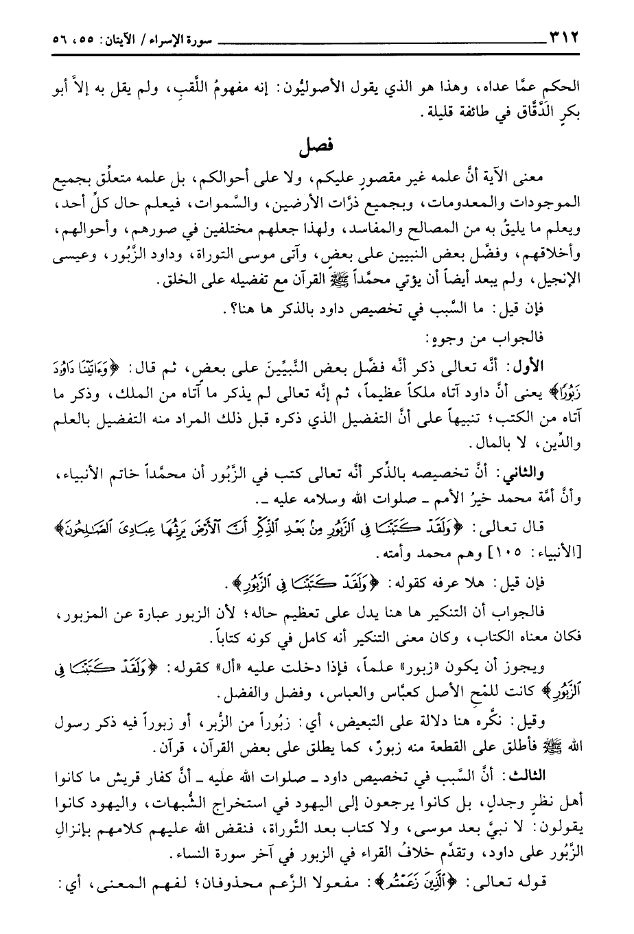 الأول: أنَّه تعالى ذكر أنَّه فضَّل بعض النَّبيِّينَ على بعض، ثم قال: {وَآتَيْنَا دَاوُودَ زَبُوراً} يعني أنَّ داود آتاه ملكاً عظيماً، ثم إنَّه تعالى لم يذكر ما آتاه من الملك، وذكر ما آتاه من الكتب؛ تنبيهاً على أنَّ التفضيل الذي ذكره قبل ذلك المراد منه التفضيل بالعلم والدِّين، لا بالمال.