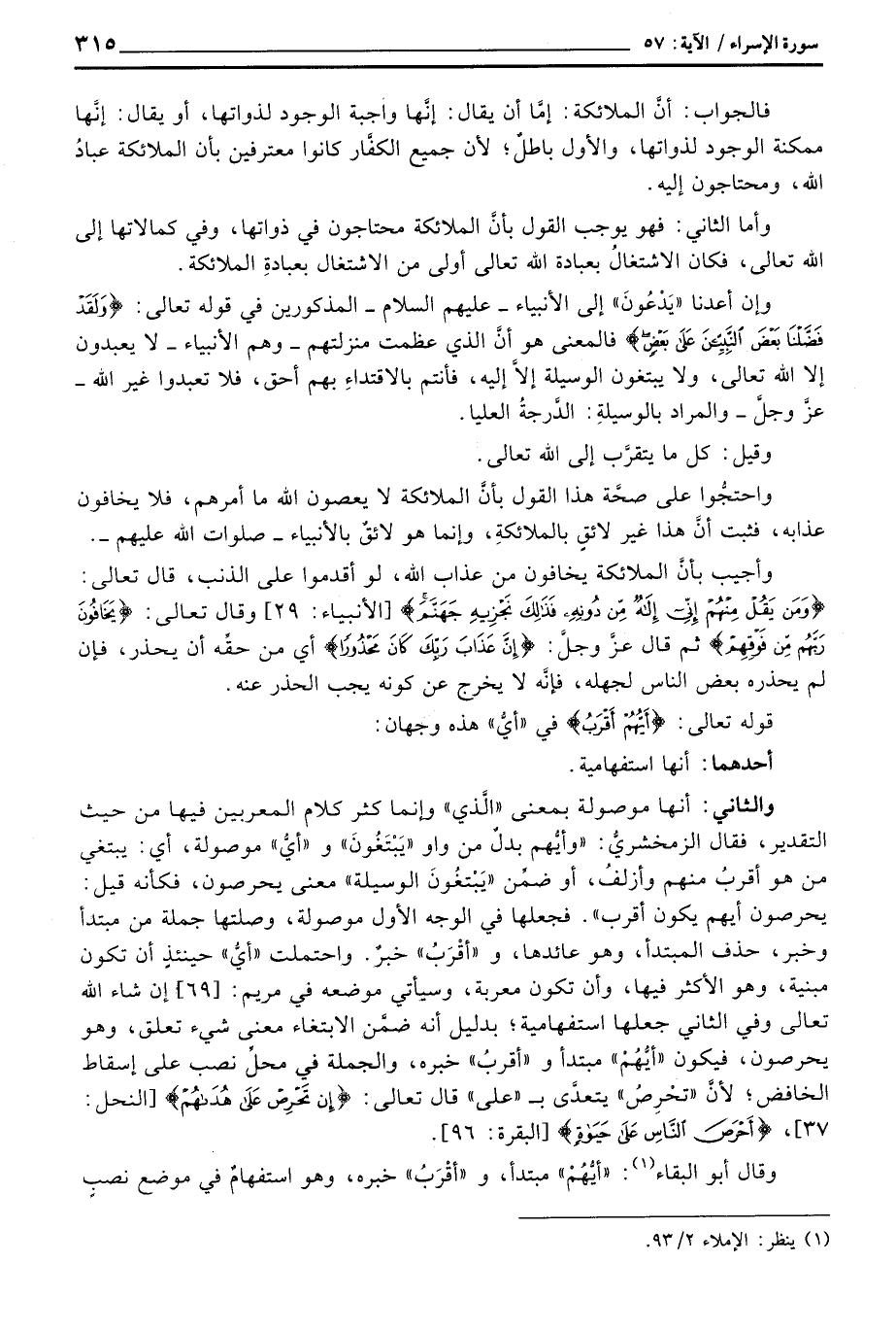 والثاني: أنها موصولة بمعنى «الَّذي» وإنما كثر كلام المعربين فيها من حيث التقدير، فقال الزمخشريُّ: «وأيُّهم بدلٌ من واو» يَبْتَغُونَ «و» أيُّ «موصولة، أي: يبتغي من هو أقربُ منهم وأزلفُ، أو ضمِّن» يَبْتغُونَ الوسيلة «معنى يحرصون، فكأنه قيل: يحرصون أيهم يكون أقرب» . فجعلها في الوجه الأول موصولة، وصلتها جملة من مبتدأ وخبر، حذف المبتدأ، وهو عائدها، و «أقْرَبُ» خبرٌ. واحتملت «أيُّ» حينئذٍ أن تكون مبنية، وهو الأكثر فيها، وأن تكون معربة، وسيأتي موضعه في مريم: [69] إن شاء الله تعالى وفي الثاني جعلها استفهامية؛ بدليل أنه ضمَّن الابتغاء معنى شيء تعلق، وهو يحرصون، فيكون «أيُّهُمْ» مبتدأ و «أقربُ» خبره، والجملة في محلِّ نصب على إسقاط الخافض؛ لأنَّ «تحْرِصُ» يتعدَّى ب «على» قال تعالى: {إِن تَحْرِصْ على هُدَاهُمْ} [النحل: 37] ، {أَحْرَصَ الناس على حَيَاةٍ} [البقرة: 96] .