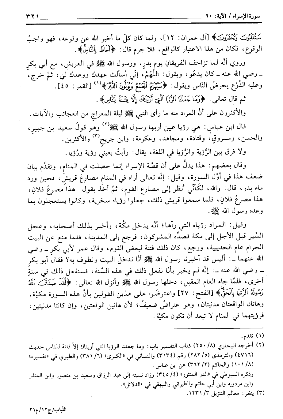 قال ابن عباسٍ: هي رؤيا عين أريها رسول الله صَلَّى اللَّهُ عَلَيْهِ وَسَلَّم َ وهو قولُ سعيد بن جبيرٍ، والحسن، ومسروقٍ، وقتادة، ومجاهد، وعكرمة، وابن جريحٍ والأكثرين.