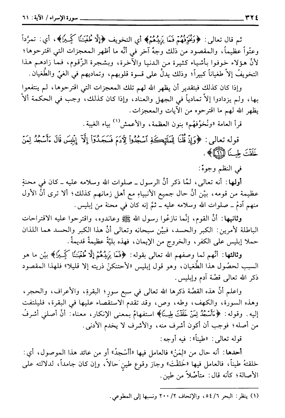 واعلم أنَّ هذه القصَّة ذكرها الله تعالى في سبع سورٍ؛ البقرةِ، والأعراف، والحجر، وهذه السورة، والكهف، وطه، وص، وقد تقدم الاستقصاء عليها في البقرة، فليلتفت إليه. وقوله: {أَأَسْجُدُ لِمَنْ خَلَقْتَ طِيناً} استفهامٌ بمعنى الإنكار، معناه: أنَّ أصلي أشرفُ من أصله؛ فوجب أن أكون أشرف منه، والأشرف لا يخدم الأدنى.