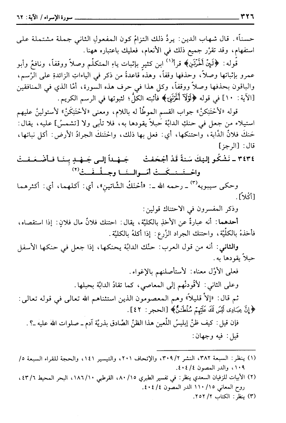 قوله «لأحْتَنِكَنَّ» جواب القسم الموطَّأ له باللام، ومعنى «لأحْتَنِكَنَّ» لأستولينَّ عليهم استيلاء من جعل في حنكِ الدَّابة حبلاً يقودها به، فلا تأبى ولا [تشمسُ] عليه، يقال: حَنكَ فلانٌ الدَّابة، واحتنكها، أي: فعل بها ذلك، واحْتَنكَ الجرادُ الأرض: أكل نباتها، قال: [الرجز]