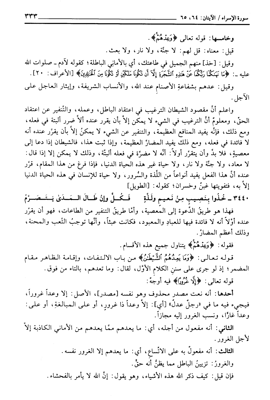 واعلم أنَّ مقصود الشيطان الترغيب في اعتقاد الباطل، وعمله، والتَّنفير عن اعتقاد الحقِّ، ومعلومٌ أنَّ الترغيب في الشيء لا يمكن إلاَّ بأن يقرر عنده ألاَّ بأن يقرَّر عنده أنه لا فائدة في فعله، ومع ذلك يفيد المضارَّ العظيمة، وإذا ثبت هذا، فالشيطان إذا دعا إلى معصيةٍ، فلا بدَّ وأن يتقرَّر أولاً: أنَّه لا مضرَّة في فعله ألبتَّة، وذلك لا يمكن إلا إذا قال: لا معاد، ولا جنَّة ولا نار، ولا حياة غير هذه الحياة الدنيا، فإذا فرغ من هذا المقام، قرَّر عنده أنَّ هذا الفعل يفيد أنواعاً من اللَّذة والسُّرور، ولا حياة للإنسان في هذه الحياة الدنيا إلاَّ به، فتفويتها غبنٌ وخسران؛ كقوله: [الطويل]