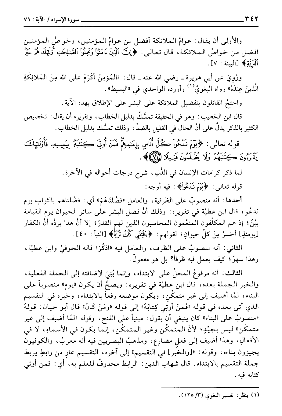 أحدها: أنه منصوبٌ على الظرفية، والعامل «فضَّلنَاهُمْ» أي: فضَّلناهم بالثواب يوم ندعُو، قال ابن عطيَّة في تقريره: وذلك أنَّ فضل البشر على سائر الحيوان يوم القيامة بيِّنٌ، إذ هم المكلَّفون المنعَّمون المحاسبون الذين لهم القدرُ؛ إلا أنَّ هذا يردُّه أنَّ الكفار [يومئذٍ] أخسرُ مِنْ كلِّ حيوانٍ؛ لقولهم: {ياليتني كُنتُ تُرَاباً} [النبأ: 40] .