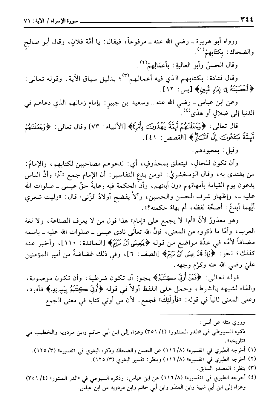 وأن تكون للحالِ، فيتعلق بمحذوفٍ، أي: ندعوهم مصاحبين لكتابهم، والإمامُ: من يقتدى به، وقال الزمخشريُّ: «ومن بدعِ التفاسير: أن الإمام جمع» أمٍّ «وأنّ الناس يدعون يوم القيامة بأمهاتهم دون آبائهم، وأن الحكمة فيه رعايةُ حقِّ عيسى - صلوات الله عليه -، وإظهار شرف الحسن والحسين، وألاَّ يفضح أولادُ الزِّنى» قال: وليت شعري أيُّهما أبدعُ: أصحَّة لفظه، أم بهاءُ حكمته؟ «.