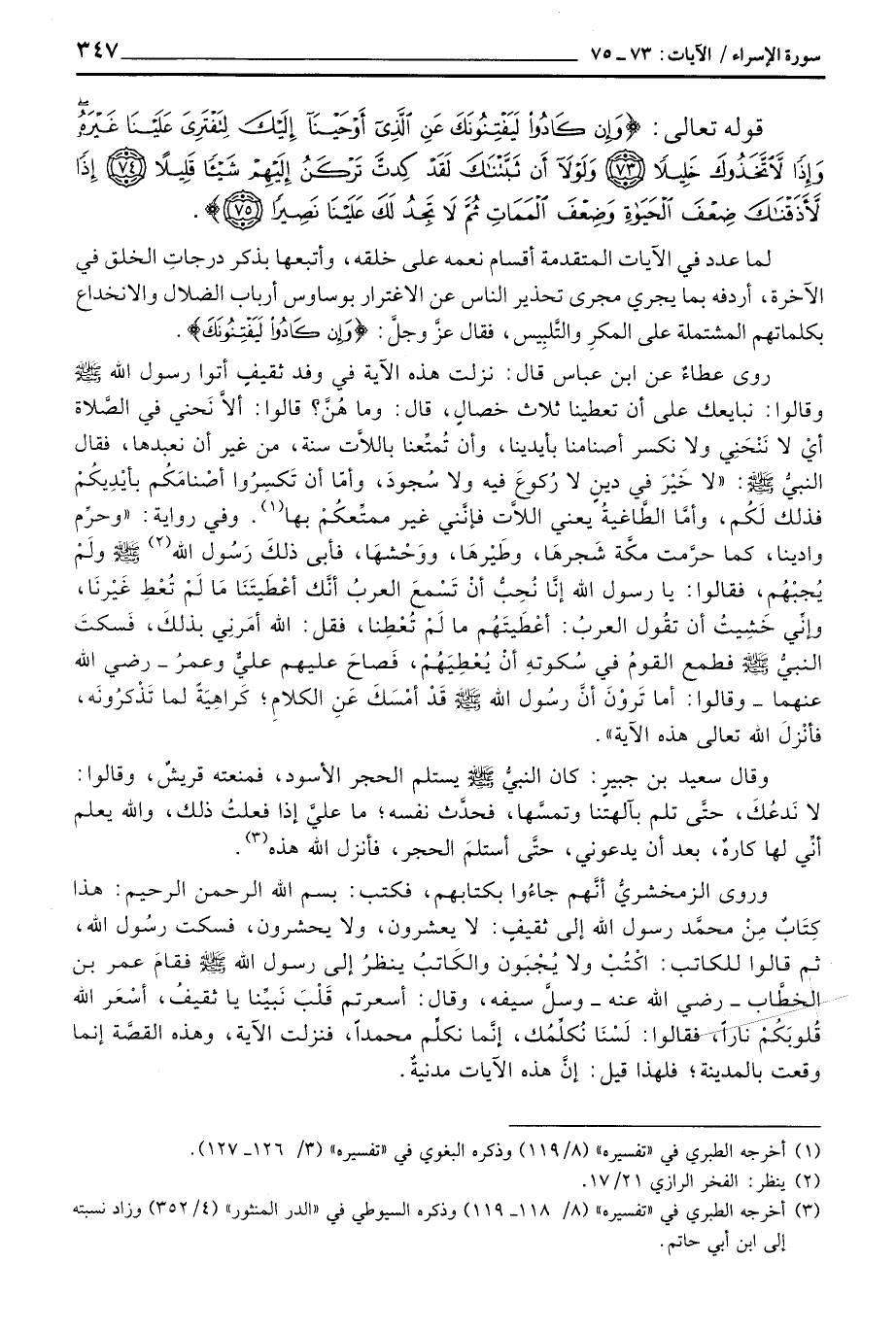 روى عطاءٌ عن ابن عباس قال: نزلت هذه الآية في وفد ثقيفٍ أتوا رسول الله صَلَّى اللَّهُ عَلَيْهِ وَسَلَّم َ وقالوا: نبايعك على أن تعطينا ثلاث خصالٍ، قال: وما هُنَّ؟ قالوا: ألاَّ نَحني في الصَّلاة أيْ لا نَنْحَنِي ولا نكسر أصنامنا بأيدينا، وأن تُمتِّعنا باللاَّت سنة، من غير أن نعبدها، فقال النبيُّ صَلَّى اللَّهُ عَلَيْهِ وَسَلَّم َ: «لا خَيْرَ في دينِ لا رُكوعَ فيه ولا سُجودَ، وأمّا أن تَكسِرُوا أصْنامَكُم بأيْدِيكُمْ فذلك لَكُم، وأمَّا الطَّاغيةُ يعني اللاَّت فإنَّني غير ممتِّعكُمْ بها» وفي رواية: «وحرِّم وادينا، كما حرَّمت مكَّة شَجرهَا، وطَيْرهَا، ووَحْشهَا، فأبى ذلكَ رَسُول الله صَلَّى اللَّهُ عَلَيْهِ وَسَلَّم َ ولَمْ يُجبْهُم، فقالوا: يا رسول الله إنَّا نُحِبُّ أنْ تَسْمعَ العربُ أنَّك أعْطَيتَنَا مَا لَمْ تُعْطِ غَيْرنَا، وإنّي خَشِيتُ أن تقُول العربُ: أعْطَيتَهُم ما لَمْ تُعْطِنا، فقل: الله أمَرنِي بذلكَ، فَسكتَ النبيُّ صَلَّى اللَّهُ عَلَيْهِ وَسَلَّم َ فطمع القومُ في سُكوتهِ أنْ يُعْطِيَهُمْ، فَصاحَ عليهم عليٌّ وعمرُ - رَضِيَ اللَّهُ عَنْهما - وقالوا: أما تَروْنَ أنَّ رسُول الله صَلَّى اللَّهُ عَلَيْهِ وَسَلَّم َ قَدْ أمْسََ عَنِ الكلامِ؛ كَراهِيَةً لما تَذْكرُونَه، فأنْزلَ الله تعالى هذه الآية» .