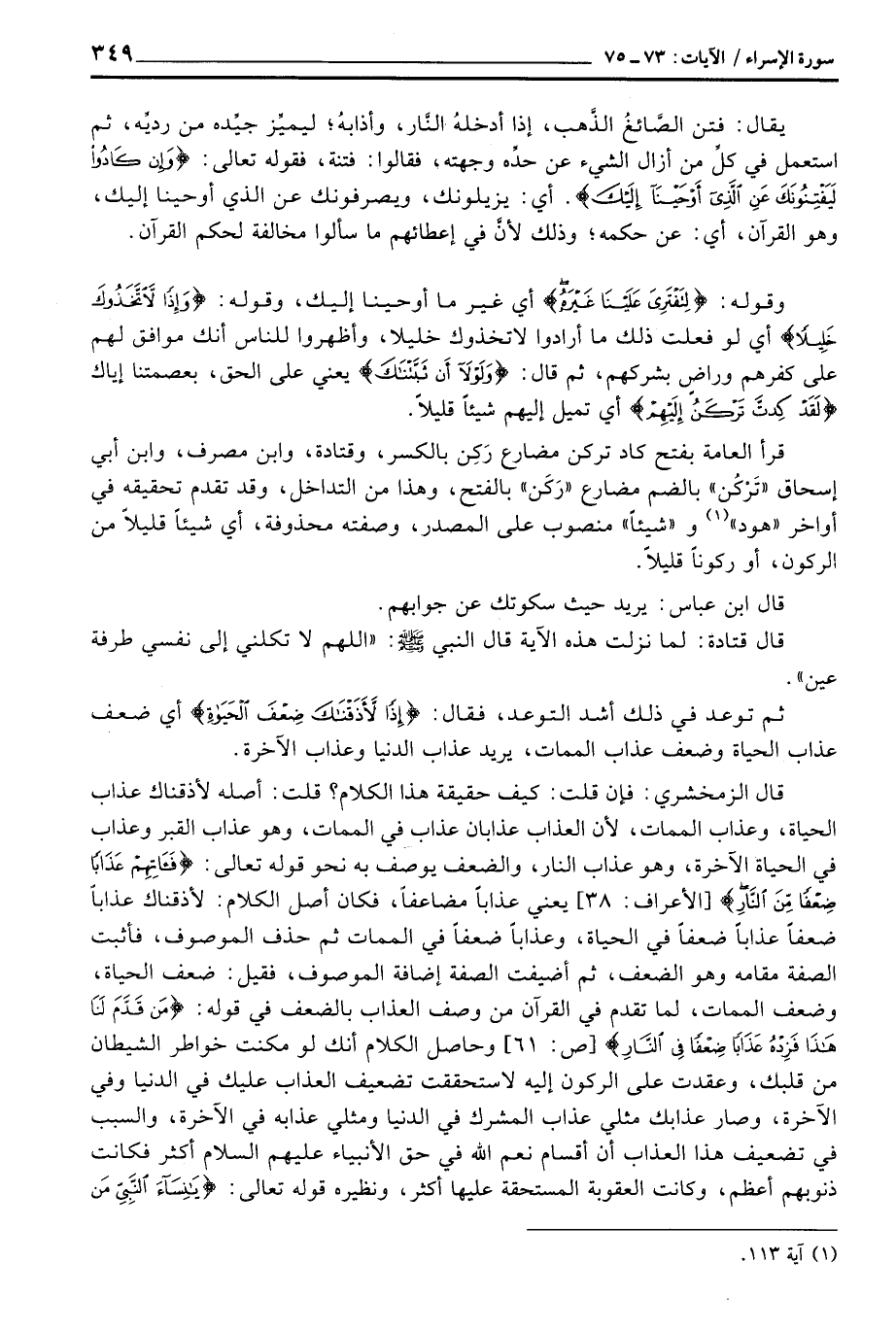 قال الزمخشري: فإن قلت: كيف حقيقة هذا الكلام؟ قلت: أصله لأذقناك عذاب الحياة، وعذاب الممات، لأن العذاب عذابان عذاب في الممات، وهو عذاب القبر وعذاب في الحياة الآخرة، وهو عذاب النار، والضعف يوصف به نحو قوله تعالى: {فَآتِهِمْ عَذَاباً ضِعْفاً مِّنَ النار} [الأعراف: 38] يعني عذاباً مضاعفاً، فكان أصل الكلام: لأذقناك عذاباً ضعفاً عذاباً ضعفاً في الحياة، وعذاباً ضعفاً في الممات ثم حذف الموصوف، فأثبت الصفة مقامه وو الضعف، ثم أضيفت الصفة إضافة الموصوف، فقيل: ضعف الحياة، وضعف الممات، لما تقدم في القرآن من وصف العذاب بالضعف في قوله: {مَن قَدَّمَ لَنَا هذا فَزِدْهُ عَذَاباً ضِعْفاً فِي النار} [ص: 61] وحاصل الكلام أنك لو مكنت خواطر الشيطان من قلبك، وعقدت على الركون إليه لاستحققت تضعيف العذاب عليك في الدنيا وفي الآخرة، وصار عذابك مثلي عذاب المشرك في الدنيا ومثلي عذابه في الآخرة، والسبب في تضعيف هذا العذاب أن أقسام نعم الله في حق الأنبياء عليهم السلام أكثر فكانت ذنوبهم أعظم، وكانت العقوبة المستحقة عليها أكثر، ونظيره قوله تعالى: {يانسآء النبي مَن