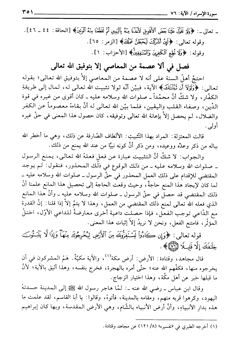 احتجَّ أهلُ السنة على أنه لا عصمة من المعاصي إلاَّ بتوفيقِ الله تعالى؛ بقوله تعالى: {وَلَوْلاَ أَن ثَبَّتْنَاكَ} الآية، فبيَّن أنَّه لولا تثبيت الله تعالى له، لمال إلى طريقةِ الكفَّار، ولا شكَّ أنَّ محمَّداً - صلوات الله وسلامه عليه - كان أقوى من غيره في قوة الدِّين، وصفاء القلب واليقين، فلما بيَّن الله تعالى له أنَّ بقاءهُ معصوماً عن الكفر والضلال، لم يحصل إلاَّ بإعانة الله تعالى وتوفيقه، كان حصول هذا المعنى في حقِّ غيره أولى.