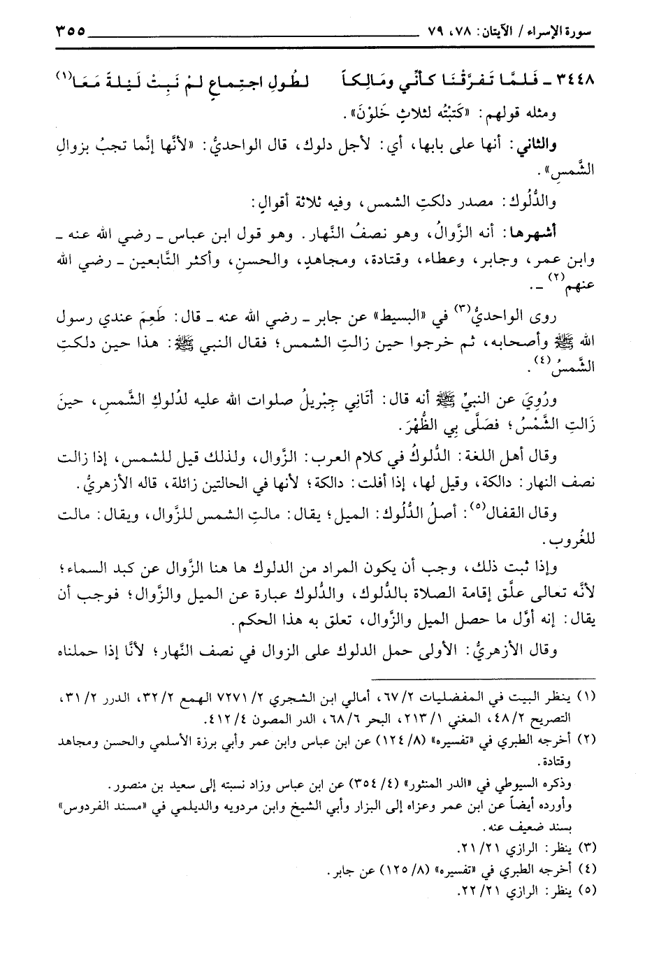 روى الواحديُّ في «البسيط» عن جابر - رَضِيَ اللَّهُ عَنْه - قال: طَعِمَ عندي رسول الله صَلَّى اللَّهُ عَلَيْهِ وَسَلَّم َ وأصحابه، ثم خرجوا حين زالتِ الشمس؛ فقال النبي صَلَّى اللَّهُ عَلَيْهِ وَسَلَّم َ: «هذا حين دلكت الشَّمسُ» .