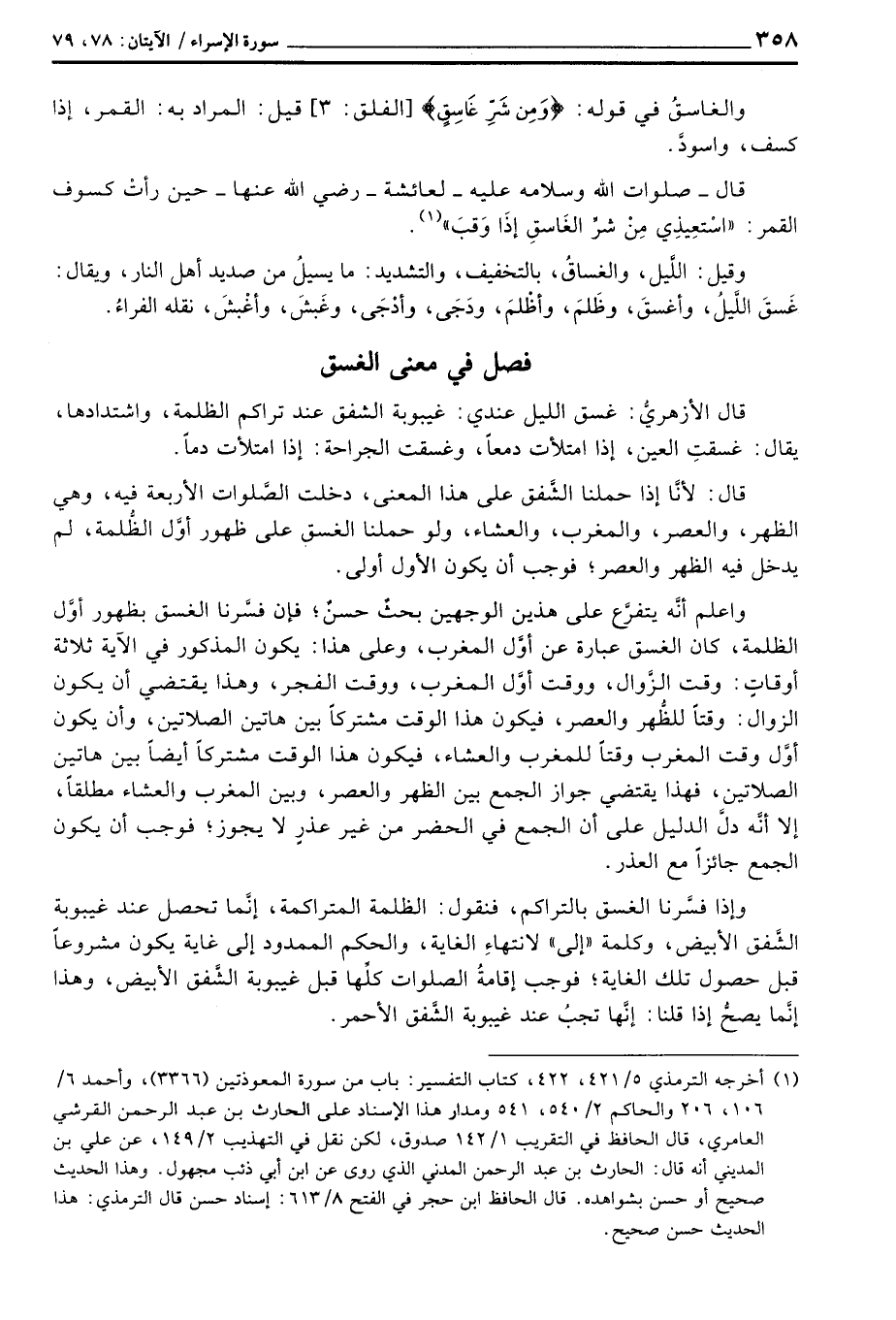 واعلم أنَّه يتفرَّع على هذين الوجهين بحثٌ حسنٌ؛ فإن فسَّرنا الغسق بظهور أوَّل الظلمة، كان الغسق عبارة عن أوَّل المغرب، وعلى هذا: يكون المذكور في الآية ثلاثة أوقاتٍ: وقت الزَّوال، ووقت أوَّل المغرب، ووقت الفجر، وهذا يقتضي أن يكون الزوال: وقتاً للظُّهر والعصر، فيكون هذا الوقت مشتركاً بين هاتين الصلاتين، وأن يكون أوَّل وقت المغرب وقتاً للمغرب والعشاء، فيكن هذا الوقت مشتركاً أيضاً بين هاتين الصلاتين، فهذا يقتضي جواز الجمع بين الظهر والعصر، وبين المغرب والعشاء مطلقاً، إلا أنَّه دلَّ الدليل على أن الجمع في الحضر من غير عذرٍ لا يجوز؛ فوجب أن يكون الجمع جائزاً مع العذر.