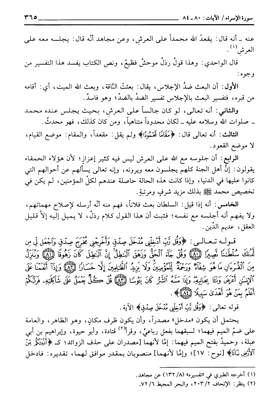عَنْه - أنه قال: يقعدُ الله محمداً على العرشِ، وعن مجاهد أنَّه قال: يجلسه معه على العرشِ.