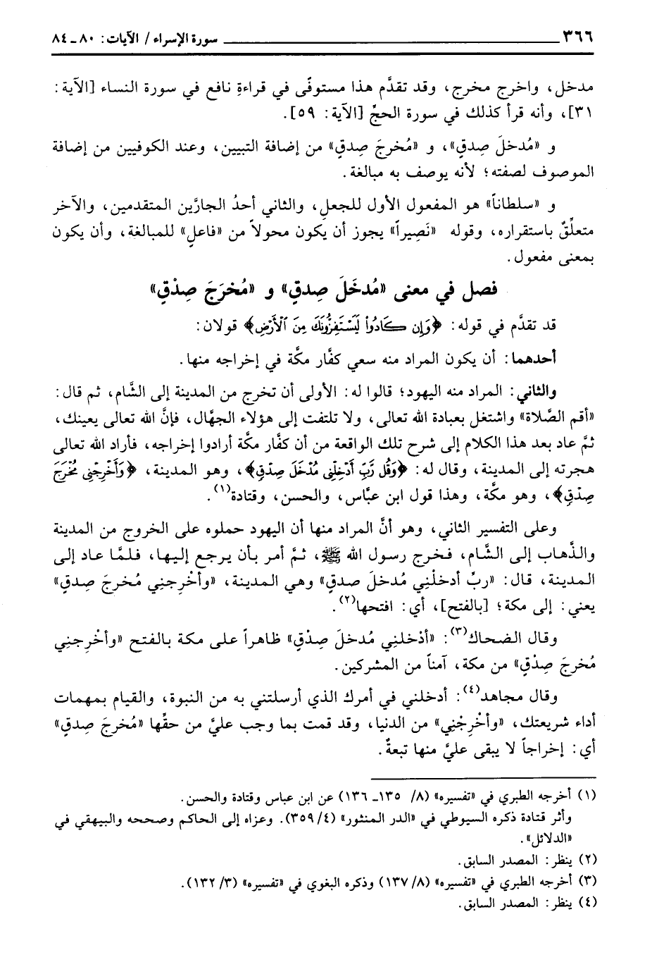 وعلى التفسير الثاني، وهو أنَّ المراد منها أن اليهود حملوه على الخروج من المدينة والذَّهاب إلى الشَّام، فخرج رسول الله صَلَّى اللَّهُ عَلَيْهِ وَسَلَّم َ، ثمَّ أمر بأن يرجع إليها، فلمَّا عاد إلى المدينة، قال: «ربِّ أدخلْنِي مُدخلَ صدقٍ» وهي المدينة، «وأخْرِجنِي مُخرجَ صِدقٍ» يعني: إلى مكة؛ [بالفتح] ، أي: افتحها.