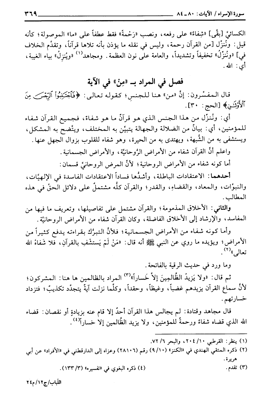 واعلم أنَّ القرآن شفاء من المراض الرُّوحانيَّة، والأمراض الجسمانية.