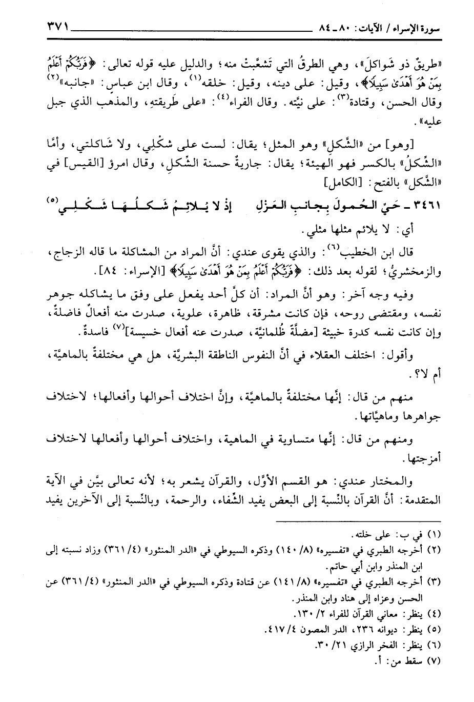 قال ابن الخطيب: والذي يقوى عندي: أنَّ المراد من المشاكلة ما قاله الزجاج، والزمخشريُّ؛ لقوله بعد ذلك: {فَرَبُّكُمْ أَعْلَمُ بِمَنْ هُوَ أهدى سَبِيلاً} [الإسراء: 84] .