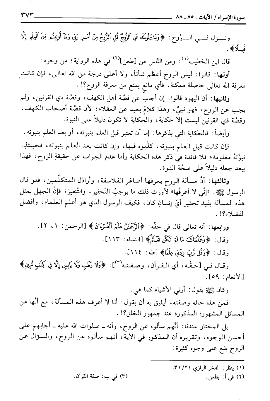 وثالثها: أنَّ مسألة الروح يعرفها أصاغر الفلاسفة، وأراذل المتكلِّمين، فلو قال الرسول صَلَّى اللَّهُ عَلَيْهِ وَسَلَّم َ: «إنِّي لا أعرفُها» لأورث ذلك ما يوجبُ التَّحقيرَ، والتَّنفيرَ؛ فإنَّ الجهل بمثل هذه المسألة يفيد تحقير أيِّ إنسانٍ كان، فكيف الرسول الذي هو أعلم العلماءِ، وأفضل الفضلاء؟} .