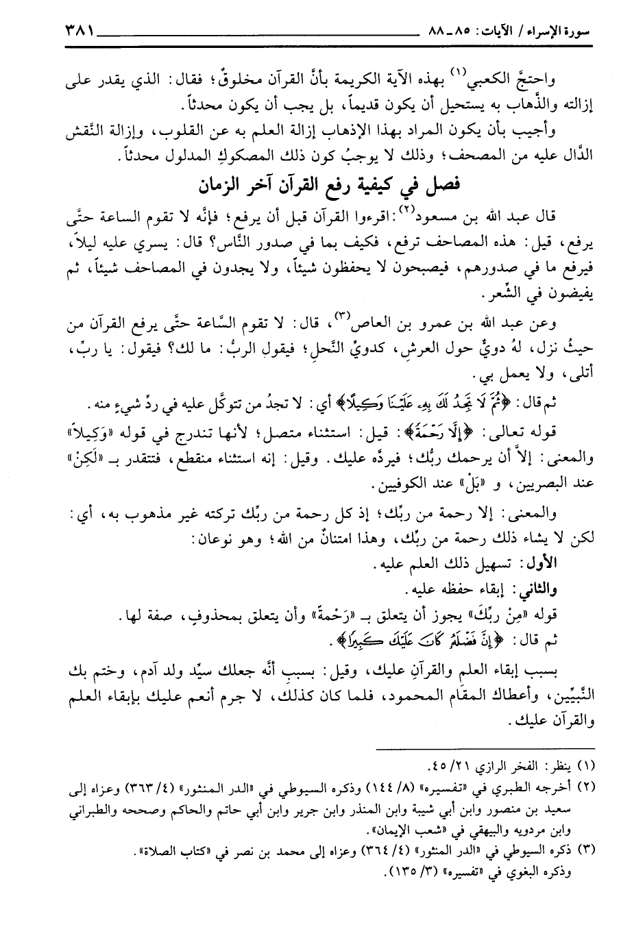 واحتج الكعبي بهذه الآية الكريمة بأنَّ القرآن مخلوقٌ؛ فقال: الذي يقدر على إزالته والذَّهاب به يستحيل أن يكون قديماً، بل يجب أن يكون محدثاً.