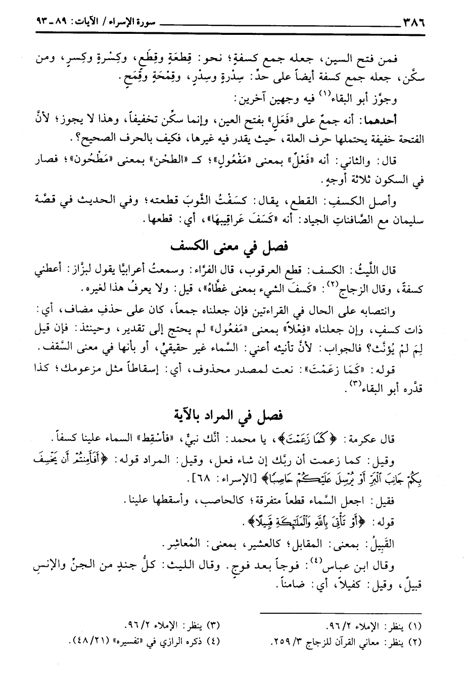 وانتصابه على الحال في القراءتين فإن جعلناه جمعاً، كان على حذفِ مضاف، أي: ذات كسفٍ، وإن جعلناه «فِعْلاً» بمعنى «مَفعُول» لم يحتج إلى تقدير، وحينئذ: فإن قيل لِمَ لمْ يُؤنَّث؟ فالجواب: لأنَّ تأنيثه أعني: السَّماء غير حقيقيٍّ، أو بأنها في معنى السَّقف.