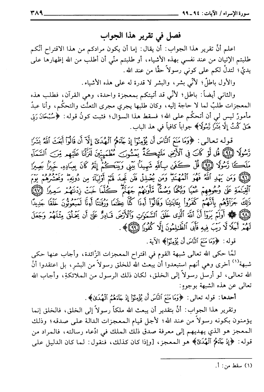 والثاني أيضاً: باطل؛ لأنِّي قد أتيتكم بمعجزة واحدة، وهي القرآن، فطلب هذه المعجزات طلبٌ لما لا حاجة إليه، وكان طلبها يجري مجرى التعنُّت والتحكُّم، وأنا عبدٌ مأمورٌ ليس لي أن أتحكَّم على الله؛ فسقط هذا السؤال؛ فثبت كونُ قوله: {سُبْحَانَ رَبِّي هَلْ كُنتُ إَلاَّ بَشَراً رَّسُولاً} جواباً كافياً في هذا الباب.