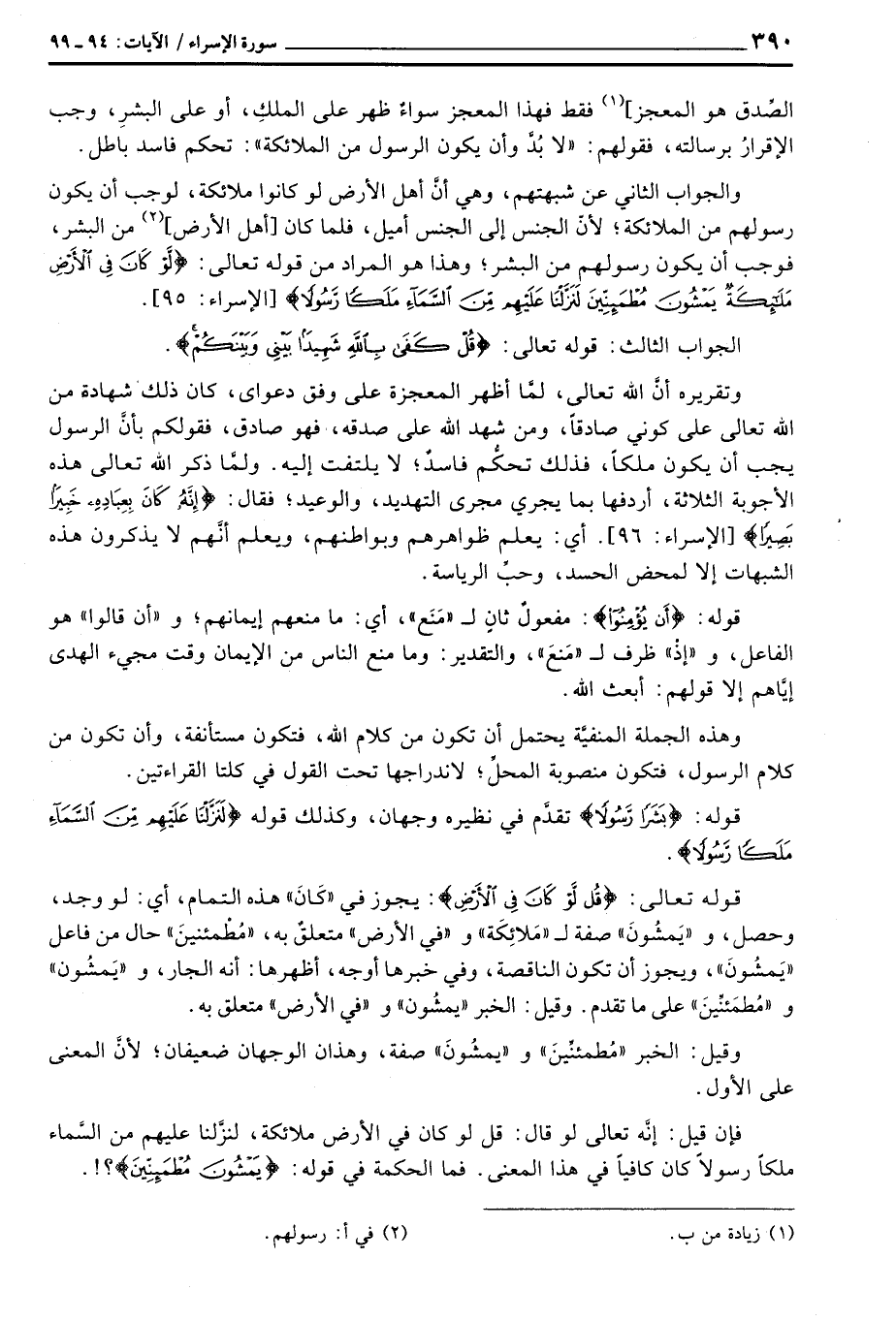 وتقريره أنَّ الله تعالى، لمَّا أظهر المعجزة على وفق دعواى، كان ذلك شهادة من الله تعالى على كوني صادقاً، ومن شهد الله على صدقه، فهو صادق، فقولكم بأنَّ الرسول يجب أن يكون ملكاً، فذلك تحكُّم فاسدٌ؛ لا يلتفت إليه. ولمَّا ذكر الله تعالى هذه الأجوبة الثلاثة، أردفها بما يجري مجرى التهديد، والوعيد؛ فقال: {إِنَّهُ كَانَ بِعِبَادِهِ خَبِيراً بَصِيراً} [الإسراء: 96] . أي: يعلم ظواهرهم وبواطنهم، ويعلم أنَّهم لا يذكرون هذه الشبهات إلا لمحض الحسد، وحبِّ الرياسة.