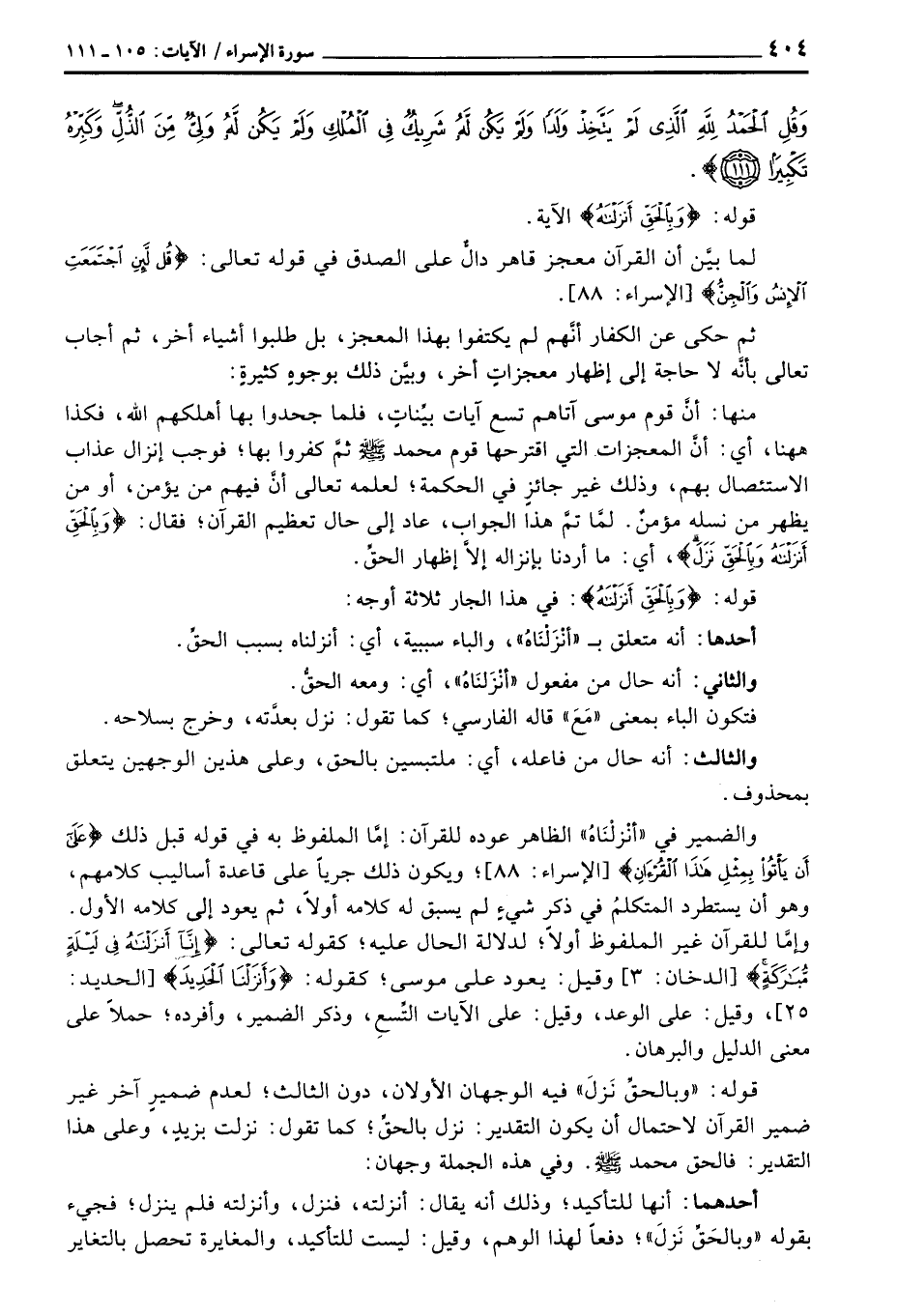 والضمير في «أنْزلْنَاهُ» الظاهر عوده للقرآن: إمَّا الملفوظ به في قوله قبل ذلك {على أَن يَأْتُواْ بِمِثْلِ هذا القرآن} [الإسراء: 88] ؛ ويكون ذلك جرياً على قاعدة أساليب كلامهم، وهو أن يستطرد المتكلمُ في ذكر شيءٍ لم يسبق له كلامه أولاً، ثم يعود إلى كلامه الأول. وإمَّا للقرآن غير الملفوظ أولاً؛ لدلالة الحال عليه؛ كقوله تعالى: {إِنَّآ أَنزَلْنَاهُ فِي لَيْلَةٍ مُّبَارَكَةٍ} [الدخان: 3] وقيل: يعود على موسى؛ كقوله: {وَأَنزْلْنَا الحديد} [الحديد: 25] ، وقيل: على الوعد، وقيل: على الآيات التِّسعِ، وذكر الضمير، وأفرده؛ حملاً على معنى الدليل والبرهان.
