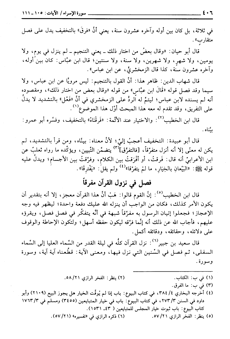 قال ابو عبيدة: التخفيف أعجبُ غليَّ؛ لأنَّ معناه: بينَّاه، ومن قرأ بالتشديد، لم يكن له معنًى إلا أنه أنزل متفرِّقاً، [فالتفرُّق] يتضمَّن التَّبيين، ويؤكِّده ما رواه ثعلبٌ عن ابن الأعرابيِّ أنه قال: فَرقتُ، أو أفْرَقتُ بين الكلامِ، وفرَّقتُ بين الأجسامِ؛ ويدلُّ عليه قوله صَلَّى اللَّهُ عَلَيْهِ وَسَلَّم َ: «البَيِّعانِ بالخِيَارِ، ما لمْ يتفرَّقا» ولم يقل: «يَفْترِقَا» .