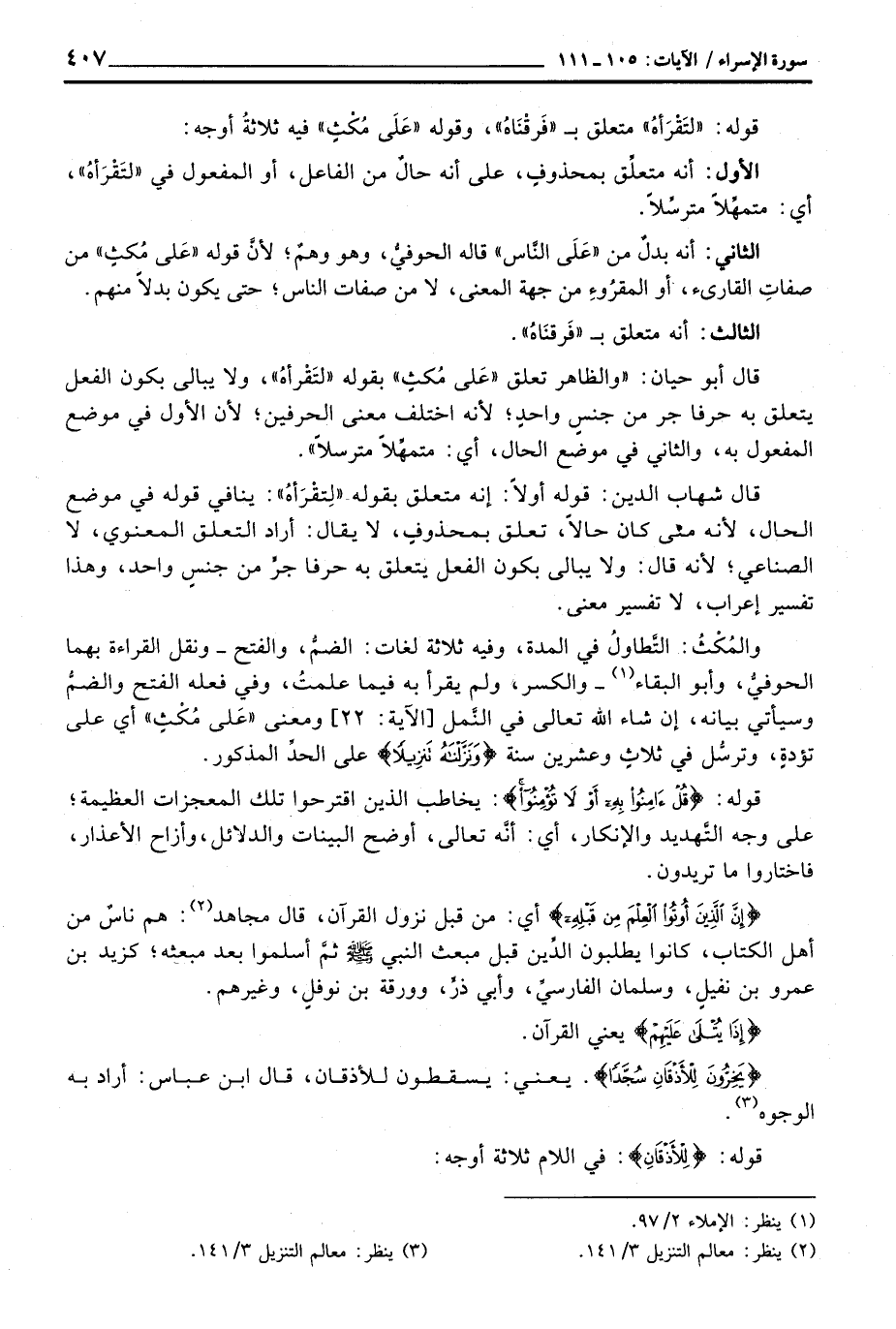 قوله: «لتَقْرَأهُ» متعلق ب «فَرقْنَاهُ» ، وقوله «عَلَى مُكْثٍ» فيه ثلاثةُ أوجه: