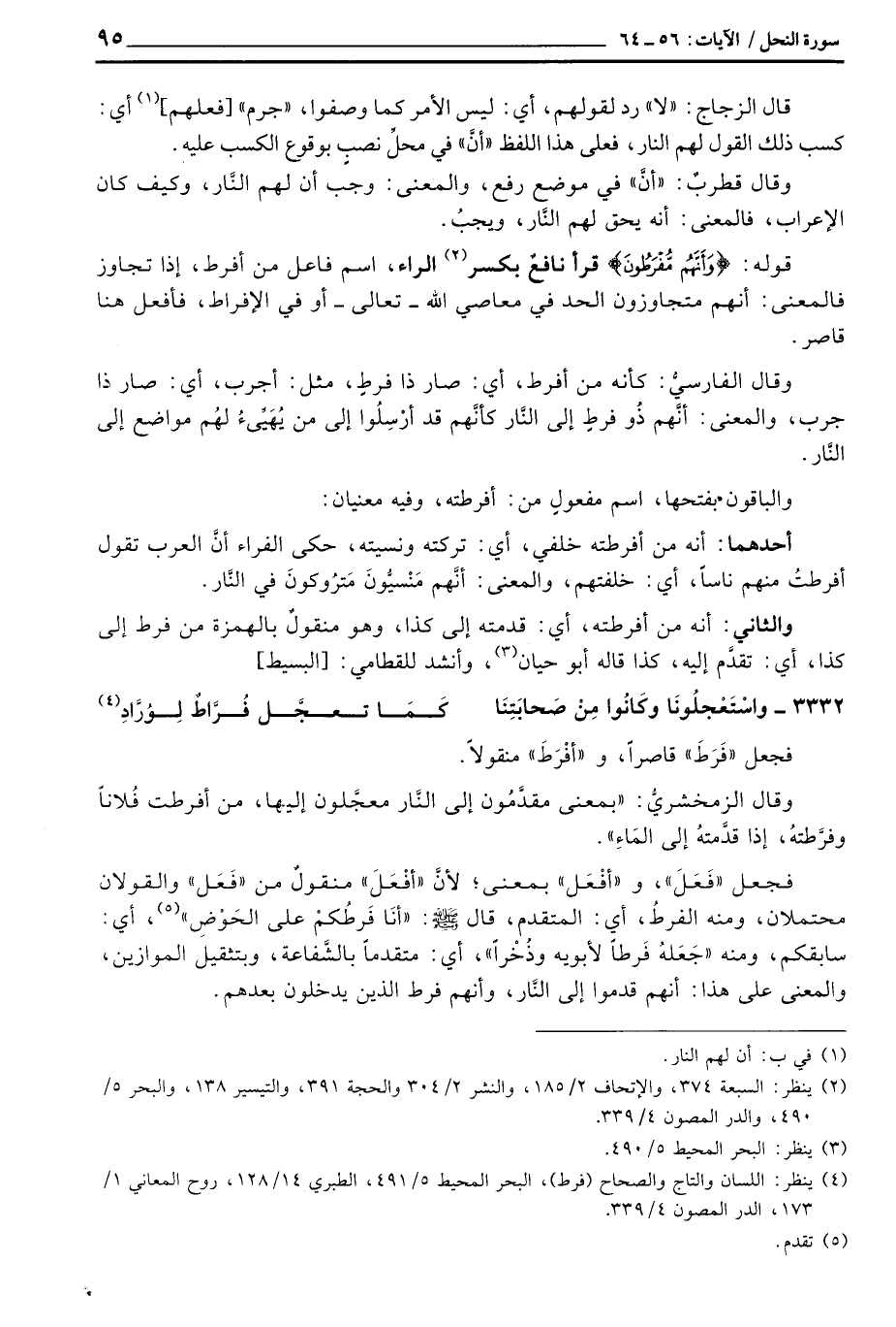 فجعل «فَعَلَ» ، و «أفْعَل» بمعنى؛ لأنَّ «أفْعَلَ» منقولٌ من «فَعَل» والقولان محتملان، ومنه الفرطُ، أي: المتقدم، قال صَلَّى اللَّهُ عَلَيْهِ وَسَلَّم َ: «أنَا فَرطُكمْ على الحَوْضِ» ، أي: سابقكم، ومنه «جَعَلهُ فَرطاً لأبويه وذُخْراً» ، أي: متقدماً بالشَّفاعة، وبتثقيل الموازين، والمعنى على هذا: أنهم قدموا إلى النَّار، وأنهم فرط الذين يدخلون بعدهم.