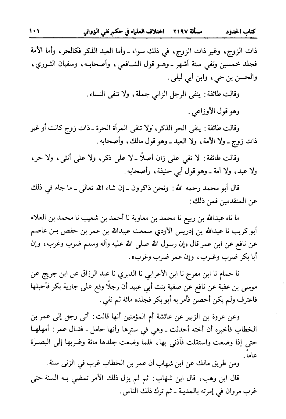 وَقَالَتْ طَائِفَةٌ: لَا نَفْيَ عَلَى زَانٍ أَصْلًا - لَا عَلَى ذَكَرٍ، وَلَا عَلَى أُنْثَى، وَلَا حُرٍّ، وَلَا عَبْدٍ، وَلَا أَمَةٍ - وَهُوَ قَوْلُ أَبِي حَنِيفَةَ، وَأَصْحَابِهِ.