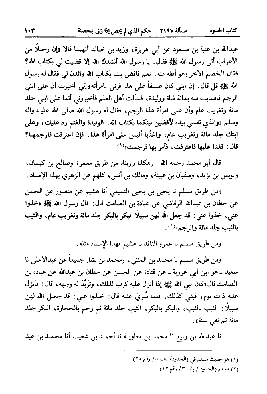 وَمِنْ طَرِيقِ مُسْلِمٍ أَنَا يَحْيَى بْنُ يَحْيَى التَّمِيمِيُّ أَنَا هُشَيْمٌ عَنْ مَنْصُورٍ عَنْ الْحَسَنِ عَنْ حِطَّانَ بْنِ عَبْدِ اللَّهِ الرَّقَاشِيِّ عَنْ عُبَادَةَ بْنِ الصَّامِتِ قَالَ: «قَالَ رَسُولُ اللَّهِ - صَلَّى اللَّهُ عَلَيْهِ وَسَلَّمَ - خُذُوا عَنِّي، خُذُوا عَنِّي: قَدْ جَعَلَ اللَّهُ لَهُنَّ سَبِيلًا الْبِكْرُ بِالْبِكْرِ جَلْدُ مِائَةٍ وَتَغْرِيبُ عَامٍ، وَالثَّيِّبُ بِالثَّيِّبِ جَلْدُ مِائَةٍ وَالرَّجْمُ» .
