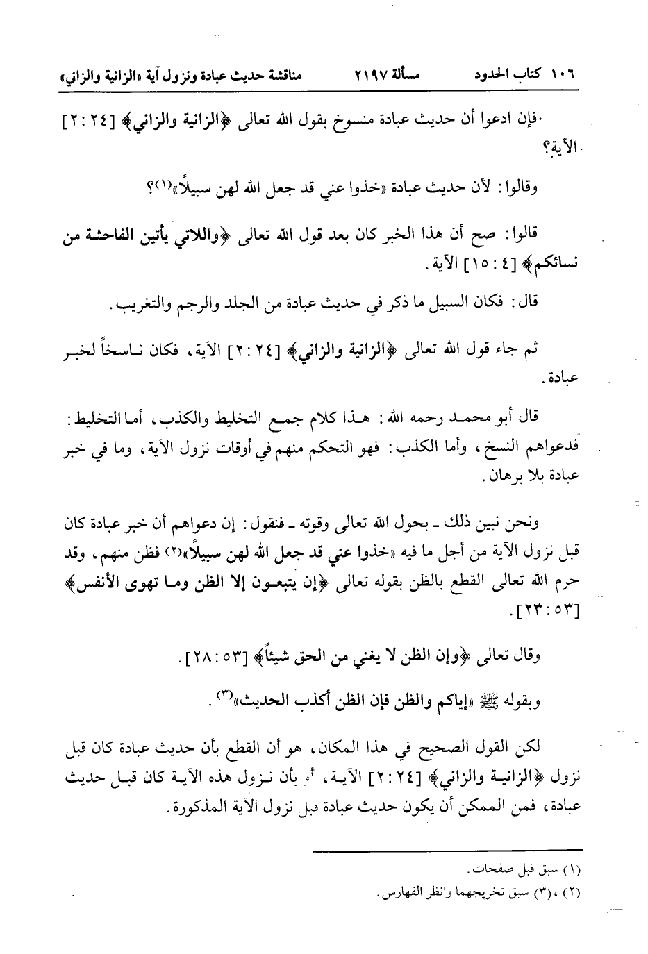 وَنَحْنُ نُبَيِّنُ ذَلِكَ - بِحَوْلِ اللَّهِ تَعَالَى وَقُوَّتِهِ - فَنَقُولُ: إنَّ دَعْوَاهُمْ أَنَّ خَبَرَ عُبَادَةَ كَانَ قَبْلَ نُزُولِ الْآيَةِ مِنْ أَجْلِ مَا فِيهِ «خُذُوا عَنِّي قَدْ جَعَلَ اللَّهُ لَهُنَّ سَبِيلًا» فَظَنٌّ مِنْهُمْ، وَقَدْ حَرَّمَ اللَّهُ تَعَالَى الْقَطْعَ بِالظَّنِّ بِقَوْلِهِ تَعَالَى {إِنْ يَتَّبِعُونَ إِلا الظَّنَّ وَمَا تَهْوَى الأَنْفُسُ} [النجم: 23] .