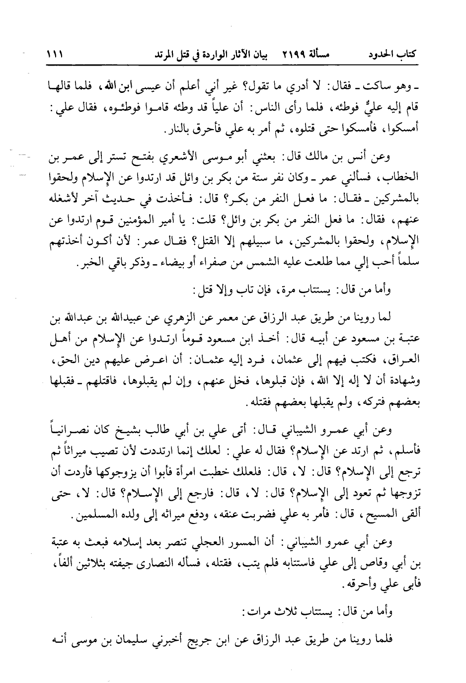 وَعَنْ أَبِي عَمْرٍو الشَّيْبَانِيِّ قَالَ: أُتِيَ عَلِيُّ بْنُ أَبِي طَالِبٍ بِشَيْخٍ كَانَ نَصْرَانِيًّا فَأَسْلَمَ، ثُمَّ ارْتَدَّ عَنْ الْإِسْلَامِ؟ فَقَالَ لَهُ عَلِيٌّ: لَعَلَّك إنَّمَا ارْتَدَدْت لَأَنْ تُصِيبَ مِيرَاثًا ثُمَّ تَرْجِعَ إلَى الْإِسْلَامِ؟ قَالَ: لَا، قَالَ: فَلَعَلَّك خَطَبْت امْرَأَةً فَأَبَوْا أَنْ يُزَوِّجُوكَهَا فَأَرَدْت أَنْ تَزَوَّجَهَا ثُمَّ تَعُودَ إلَى الْإِسْلَامِ؟ قَالَ: لَا، قَالَ: فَارْجِعْ إلَى الْإِسْلَامِ؟ قَالَ: لَا، حَتَّى أَلْقَى الْمَسِيحَ، قَالَ: فَأَمَرَ بِهِ عَلِيٌّ فَضُرِبَتْ عُنُقُهُ، وَدَفَعَ مِيرَاثَهُ إلَى وُلْدِهِ الْمُسْلِمِينَ.