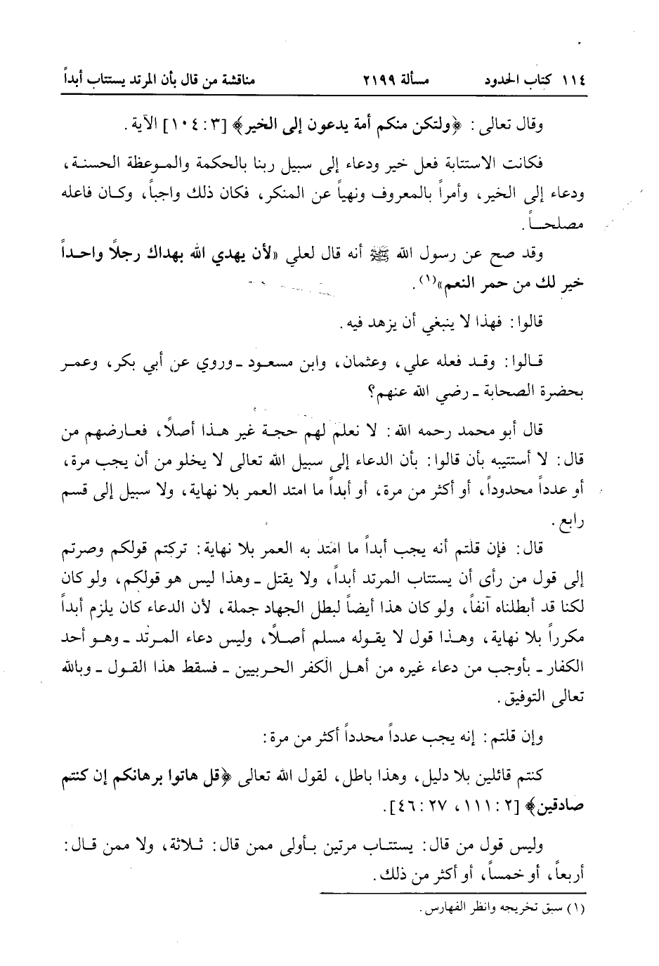 قَالَ: فَإِنْ قُلْتُمْ: إنَّهُ يَجِبُ أَبَدًا مَا امْتَدَّ بِهِ الْعُمْرُ بِلَا نِهَايَةٍ: تَرَكْتُمْ قَوْلَكُمْ وَصِرْتُمْ إلَى قَوْلِ مَنْ رَأَى أَنْ يُسْتَتَابَ الْمُرْتَدُّ أَبَدًا، وَلَا يُقْتَلَ - وَهَذَا لَيْسَ هُوَ قَوْلَكُمْ، وَلَوْ كَانَ لَكُنَّا قَدْ أَبْطَلْنَاهُ آنِفًا، وَلَوْ كَانَ هَذَا أَيْضًا لَبَطَلَ الْجِهَادُ جُمْلَةً، لِأَنَّ الدُّعَاءَ كَانَ يَلْزَمُ أَبَدًا مُكَرَّرًا بِلَا نِهَايَةٍ، وَهَذَا قَوْلٌ لَا يَقُولُهُ مُسْلِمٌ أَصْلًا، وَلَيْسَ دُعَاءُ الْمُرْتَدِّ - وَهُوَ أَحَدُ الْكُفَّارِ - بِأَوْجَبَ مِنْ دُعَاءِ غَيْرِهِ مِنْ أَهْلِ الْكُفْرِ الْحَرْبِيِّينَ - فَسَقَطَ هَذَا الْقَوْلُ - وَبِاَللَّهِ تَعَالَى التَّوْفِيقُ.