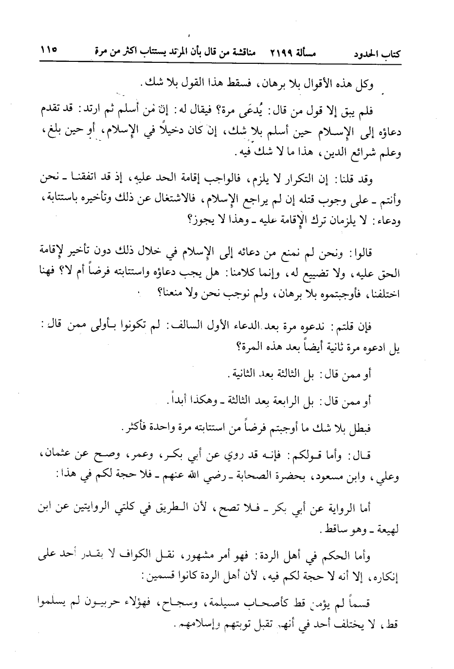 وَقَدْ قُلْنَا: إنَّ التَّكْرَارَ لَا يَلْزَمُ، فَالْوَاجِبُ إقَامَةُ الْحَدِّ عَلَيْهِ، إذْ قَدْ اتَّفَقْنَا - نَحْنُ وَأَنْتُمْ - عَلَى وُجُوبِ قَتْلِهِ إنْ لَمْ يُرَاجِعْ الْإِسْلَامَ، فَالِاشْتِغَالُ عَنْ ذَلِكَ وَتَأْخِيرُهُ بِاسْتِتَابَةٍ، وَدُعَاءٍ: لَا يُلْزِمَانِ تَرْكَ الْإِقَامَةِ عَلَيْهِ - وَهَذَا لَا يَجُوزُ؟ قَالُوا: وَنَحْنُ لَمْ نَمْنَعْ مِنْ دُعَائِهِ إلَى الْإِسْلَامِ فِي خِلَالِ ذَلِكَ دُونَ تَأْخِيرٍ لِإِقَامَةِ الْحَقِّ عَلَيْهِ، وَلَا تَضْيِيعٍ لَهُ، وَإِنَّمَا كَلَامُنَا: هَلْ يَجِبُ دُعَاؤُهُ وَاسْتِتَابَتُهُ فَرْضًا أَمْ لَا؟ فَهَاهُنَا اخْتَلَفْنَا، فَأَوْجَبْتُمُوهُ بِلَا بُرْهَانٍ، وَلَمْ نُوجِبْ نَحْنُ وَلَا مَنَعْنَا؟ فَإِنْ قُلْتُمْ: نَدْعُوهُ مَرَّةً بَعْدَ الدُّعَاءِ الْأَوَّلِ السَّالِفِ: لَمْ تَكُونُوا بِأَوْلَى مِمَّنْ قَالَ: بَلْ اُدْعُوهُ مَرَّةً ثَانِيَةً أَيْضًا بَعْدَ هَذِهِ الْمَرَّةِ؟ أَوْ مِمَّنْ قَالَ: بَلْ الثَّالِثَةُ بَعْدَ الثَّانِيَةِ.