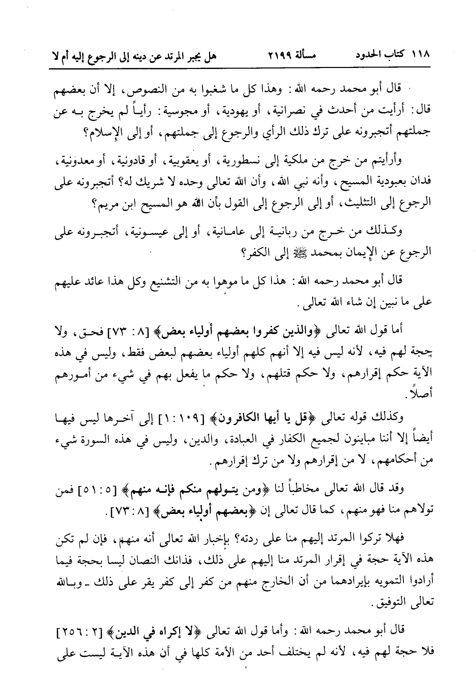 قَالَ أَبُو مُحَمَّدٍ - رَحِمَهُ اللَّهُ -: وَهَذَا كُلُّ مَا شَغَبُوا بِهِ مِنْ النُّصُوصِ، إلَّا أَنَّ بَعْضَهُمْ قَالَ: أَرَأَيْت مَنْ أَحْدَثَ فِي نَصْرَانِيَّةٍ، أَوْ يَهُودِيَّةٍ، أَوْ مَجُوسِيَّةٍ: رَأْيًا لَمْ يَخْرُجْ بِهِ عَنْ جُمْلَتِهِمْ أَتُجْبِرُونَهُ عَلَى تَرْكِ ذَلِكَ الرَّأْيِ وَالرُّجُوعِ إلَى جُمْلَتِهِمْ، أَوْ إلَى الْإِسْلَامِ؟ وَأَرَأَيْتُمْ مَنْ خَرَجَ مِنْ مَلْكَانِيَّةٍ إلَى نُسْطُورِيَّةٍ، أَوْ يَعْقُوبِيَّةٍ، أَوْ قَادُونِيَّةٍ، أَوْ مَعْدُونِيَّةٍ، فَدَانَ بِعُبُودِيَّةِ الْمَسِيحِ، وَأَنَّهُ نَبِيُّ اللَّهِ، وَأَنَّ اللَّهَ تَعَالَى وَحْدَهُ لَا شَرِيكَ لَهُ؟ أَتُجْبِرُونَهُ عَلَى الرُّجُوعِ إلَى التَّثْلِيثِ، أَوْ إلَى الرُّجُوعِ إلَى الْقَوْلِ بِأَنَّ اللَّهَ هُوَ الْمَسِيحُ ابْنُ مَرْيَمَ؟ وَكَذَلِكَ مَنْ خَرَجَ مِنْ رَبَّانِيَّةٍ إلَى عَامَانِيَّةٍ، أَوْ إلَى عِيسَوِيَّةٍ، أَتُجْبِرُونَهُ عَلَى الرُّجُوعِ عَنْ الْإِيمَانِ بِمُحَمَّدٍ - صَلَّى اللَّهُ عَلَيْهِ وَسَلَّمَ - إلَى الْكُفْرِ؟ قَالَ أَبُو مُحَمَّدٍ - رَحِمَهُ اللَّهُ -: هَذَا كُلُّ مَا مَوَّهُوا بِهِ مِنْ التَّشْنِيعِ وَكُلُّ هَذَا عَائِدٌ عَلَيْهِمْ عَلَى مَا نُبَيِّنُ إنْ شَاءَ اللَّهُ تَعَالَى.