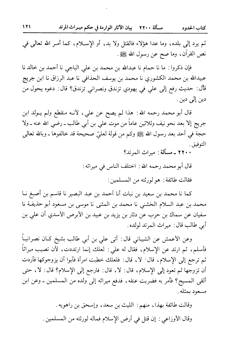 2200 - مَسْأَلَةٌ: مِيرَاثُ الْمُرْتَدِّ؟ قَالَ أَبُو مُحَمَّدٍ - رَحِمَهُ اللَّهُ -: اخْتَلَفَ النَّاسُ فِي مِيرَاثِهِ: فَقَالَتْ طَائِفَةٌ: هُوَ لِوَرَثَتِهِ مِنْ الْمُسْلِمِينَ: كَمَا أَنَا مُحَمَّدُ بْنُ سَعِيدِ بْنِ نَبَاتٍ أَنَا أَحْمَدُ بْنُ عَبْدِ الْبَصِيرِ أَنَا قَاسِمُ بْنُ أَصْبَغَ أَنَا مُحَمَّدُ بْنُ عَبْدِ السَّلَامِ الْخُشَنِيُّ أَنَا مُحَمَّدُ بْنُ الْمُثَنَّى أَنَا مُوسَى بْنُ مَسْعُودٍ أَبُو حُذَيْفَةَ أَنَا سُفْيَانُ عَنْ سِمَاكِ بْنِ حَرْبٍ عَنْ دِثَارِ بْنِ يَزِيدَ بْنِ عُبَيْدِ بْنِ الْأَبْرَصِ الْأَسَدِيِّ أَنَّ عَلِيَّ بْنَ أَبِي طَالِبٍ قَالَ: مِيرَاثُ الْمُرْتَدِّ لِوَلَدِهِ.