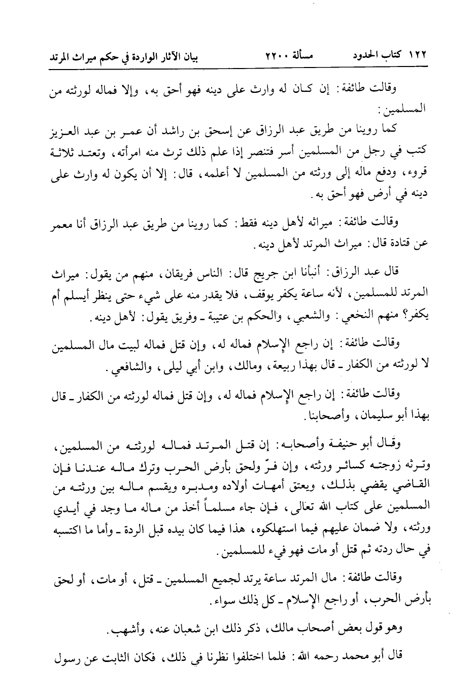 قَالَ عَبْدُ الرَّزَّاقِ: أَنْبَأَنَا ابْنُ جُرَيْجٍ قَالَ: النَّاسُ فَرِيقَانِ، مِنْهُمْ مَنْ يَقُولُ: مِيرَاثُ الْمُرْتَدِّ لِلْمُسْلِمِينَ، لِأَنَّهُ سَاعَةَ يَكْفُرُ يُوقَفُ، فَلَا يُقْدَرُ مِنْهُ عَلَى شَيْءٍ حَتَّى يُنْظَرَ أَيُسْلِمُ أَمْ يَكْفُرُ؟ مِنْهُمْ النَّخَعِيُّ: وَالشَّعْبِيُّ، وَالْحَكَمُ بْنُ عُتَيْبَةَ - وَفَرِيقٌ يَقُولُ: لِأَهْلِ دِينِهِ. وَقَالَتْ طَائِفَةٌ: إنْ رَاجَعَ الْإِسْلَامَ فَمَالُهُ لَهُ، وَإِنْ قُتِلَ فَمَالُهُ لِبَيْتِ مَالِ الْمُسْلِمِينَ لَا لِوَرَثَتِهِ مِنْ الْكُفَّارِ - قَالَ بِهَذَا رَبِيعَةُ، وَمَالِكٌ، وَابْنُ أَبِي لَيْلَى، وَالشَّافِعِيُّ.